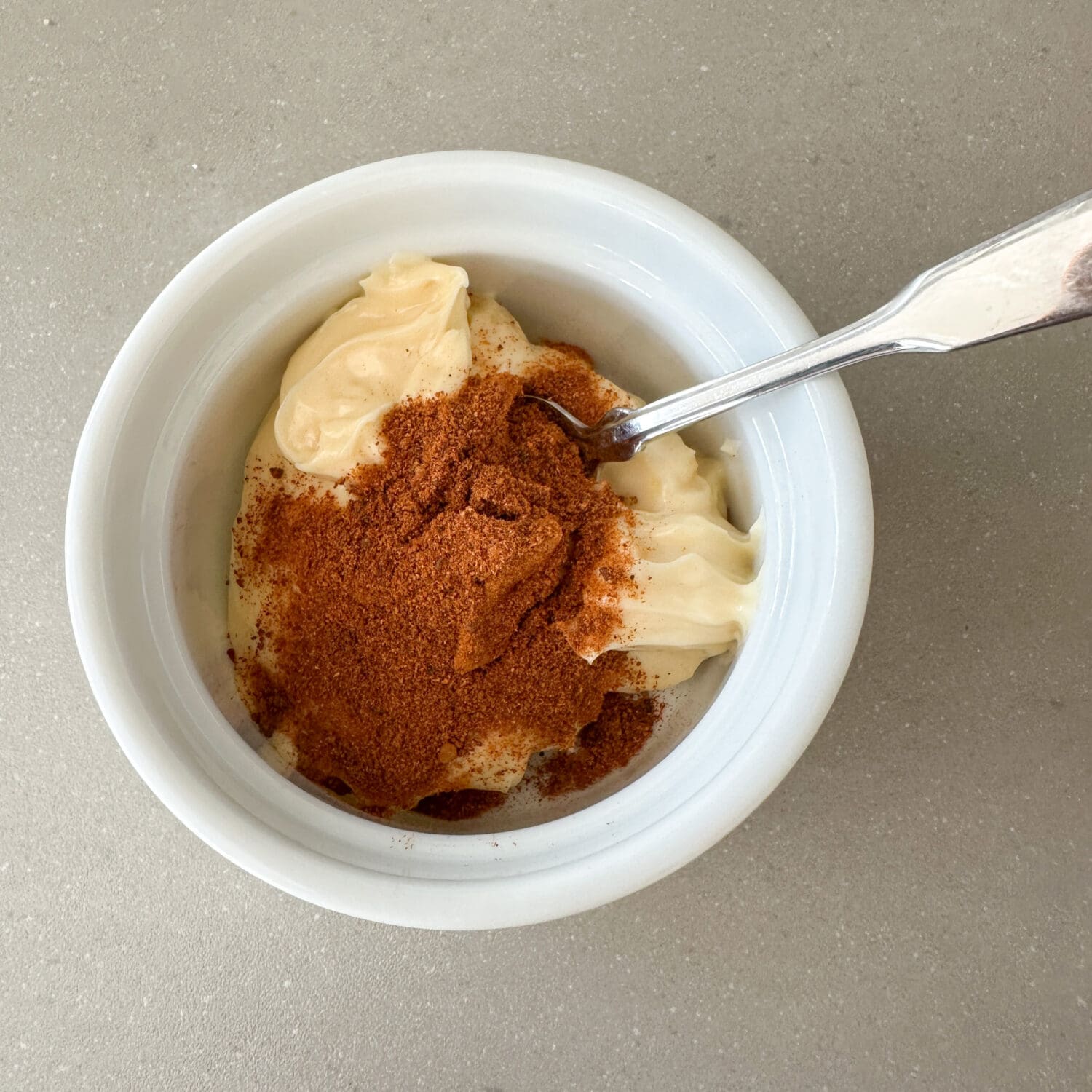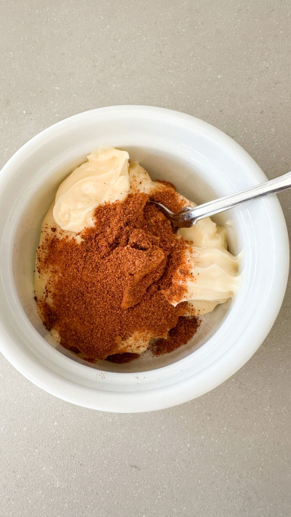 Jetzt noch Mayonnaise und 1 EL Paprika verrühren. |