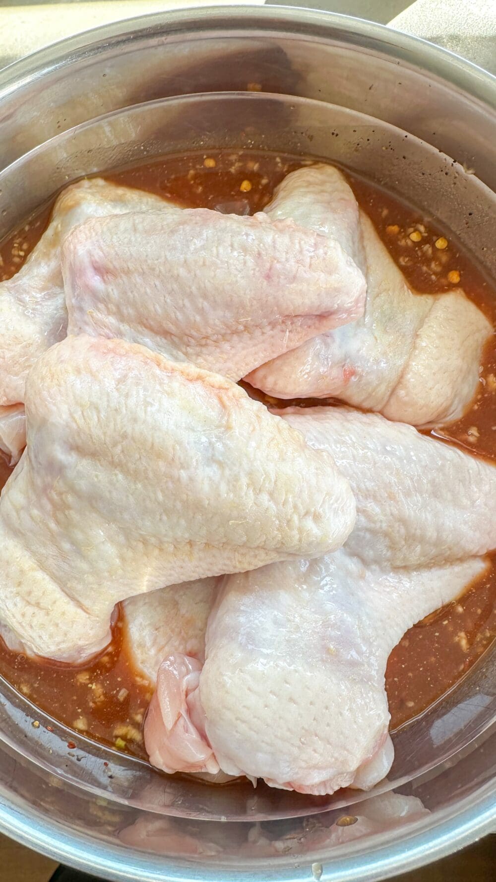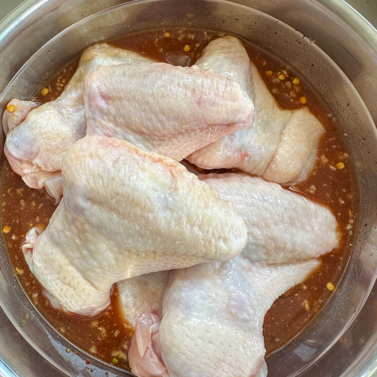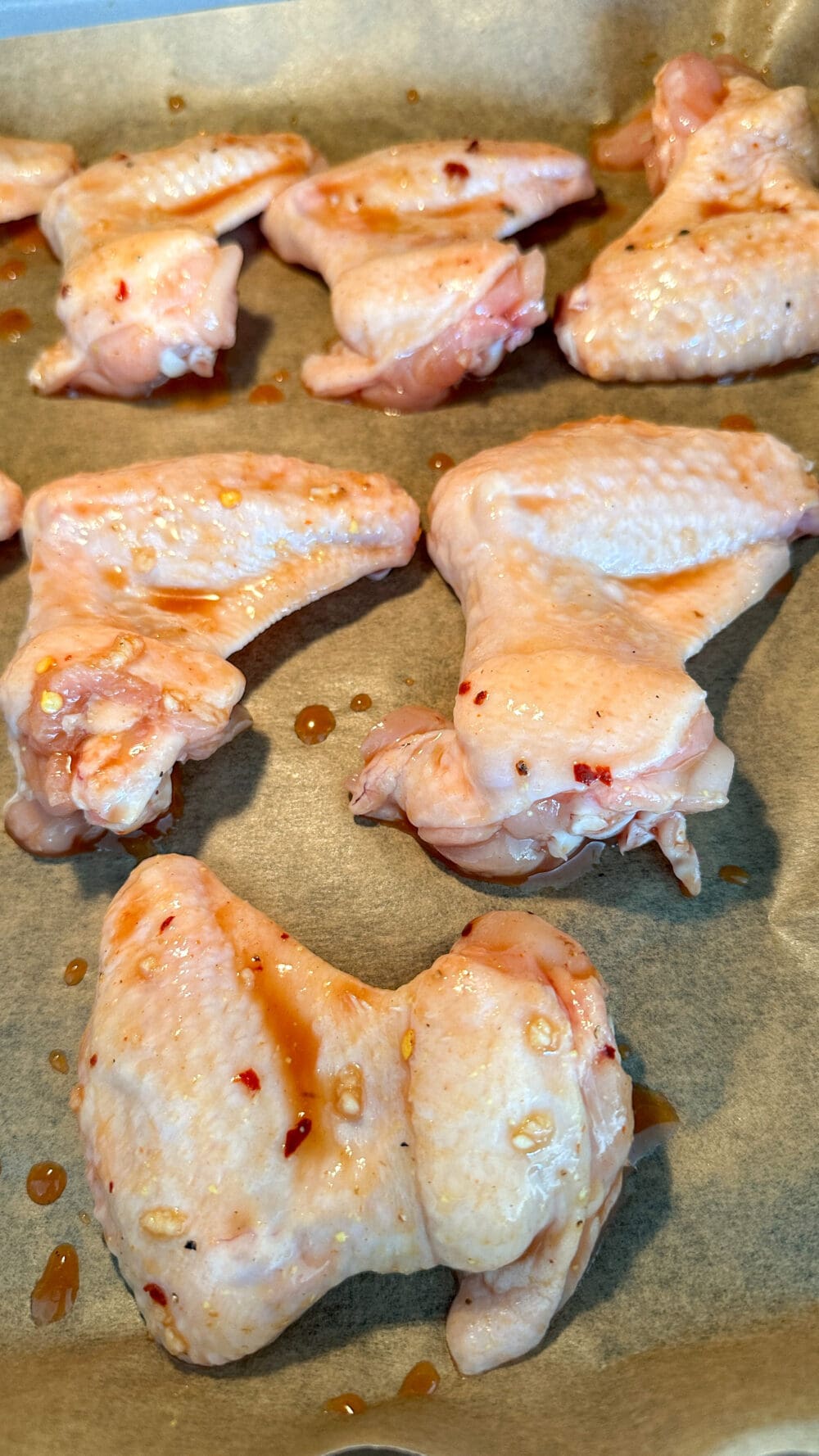 | 2. | Dann die Hähnchenflügel 1 Stunde im Kühlschrank darin marinieren, für 20 Minuten Raumtemperatur annehmen lassen und… |