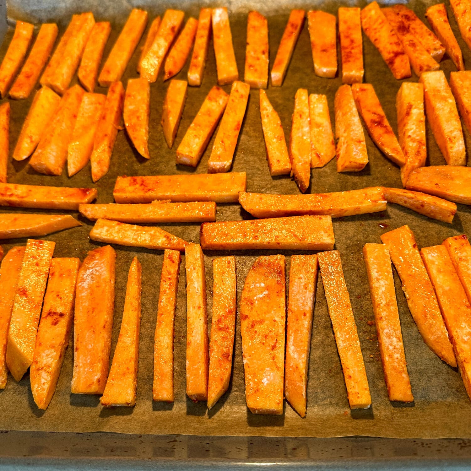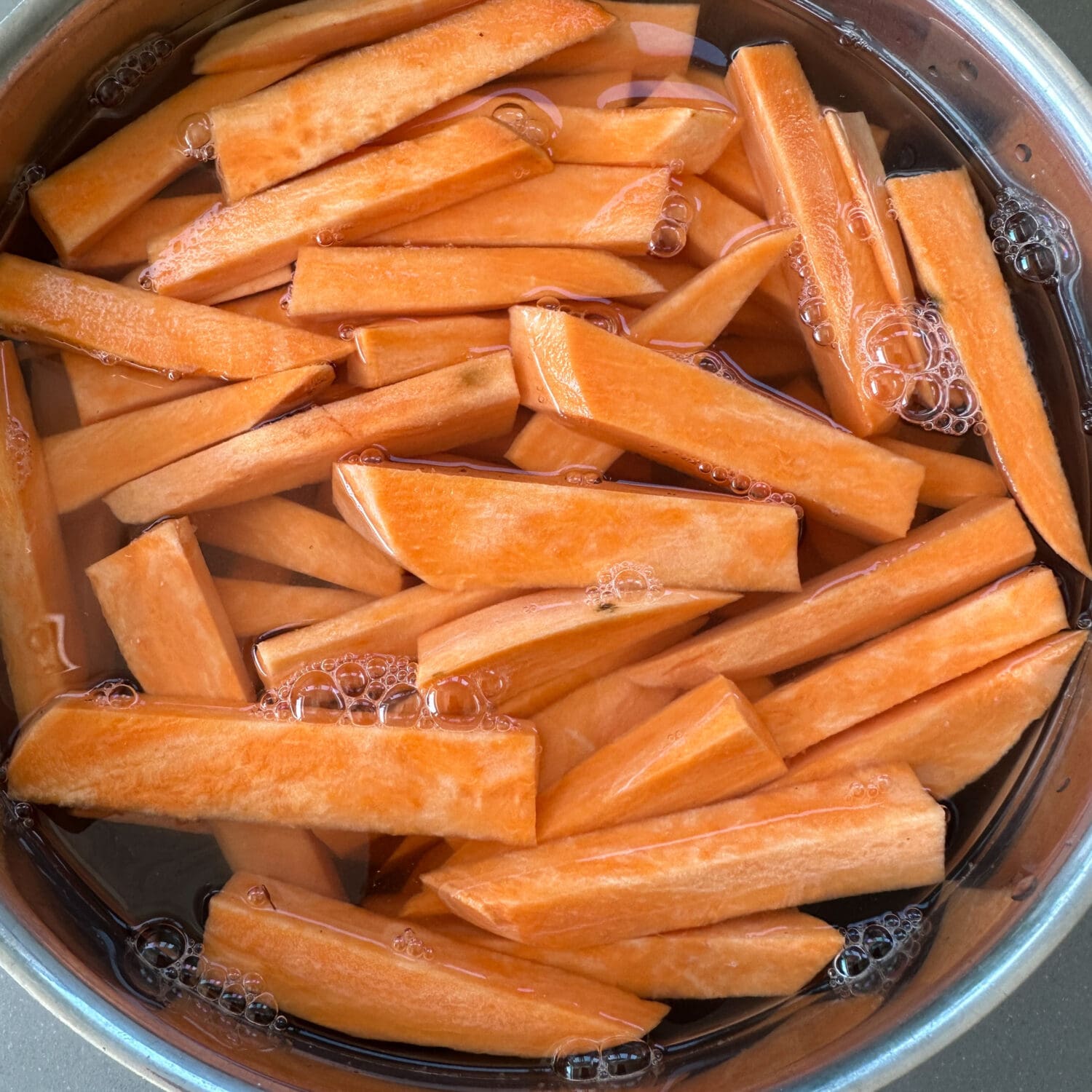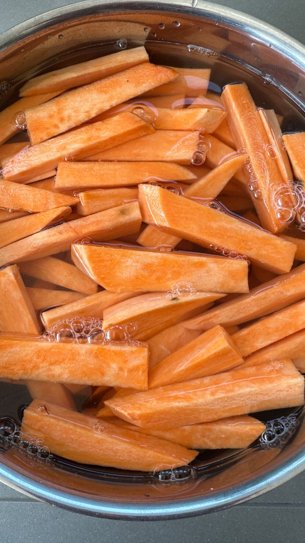 Als nächstes Süßkartoffeln schälen, in Stifte schneiden, wässern und gut trockentupfen. |
