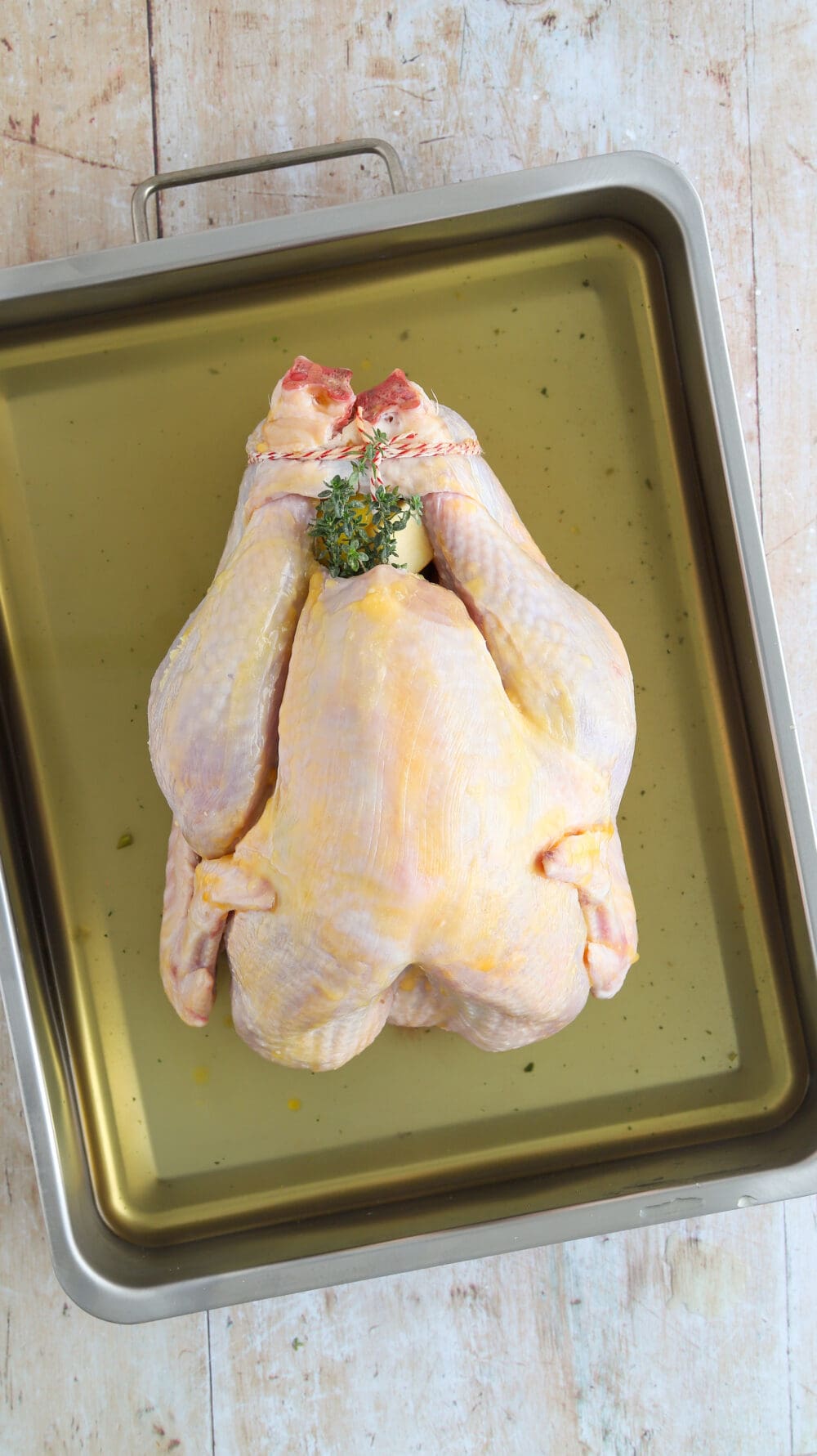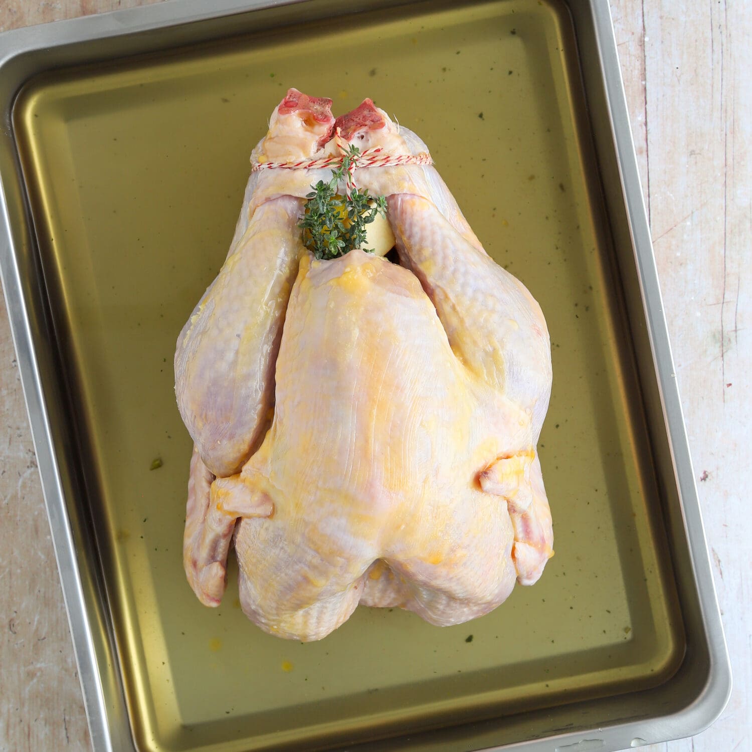 Zuerst die Pute in einen Bräter legen und mit Küchenpapier trockentupfen. |