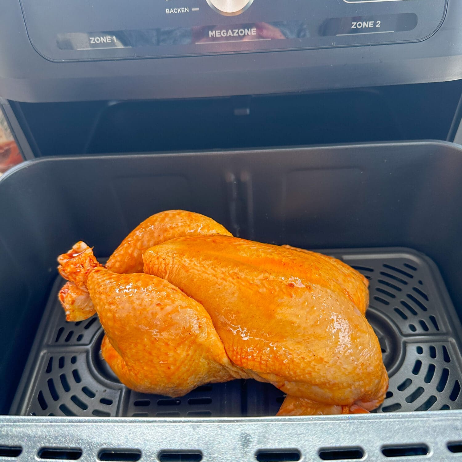 Das Hähnchen bei 190 Grad circa 30 Minuten in die Heißluftfritteuse geben. |