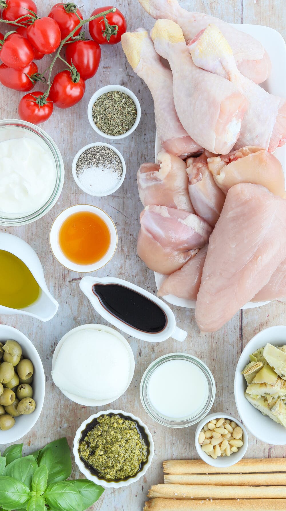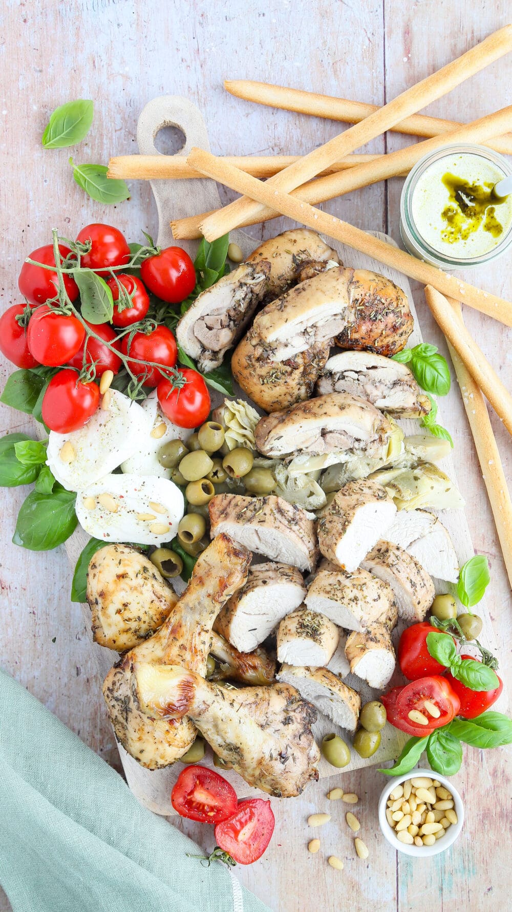 …Pollo fino, Drumsticks und Putenfilet dazulegen und mit Pinienkernen, Basilikum und Grissini genießen. |