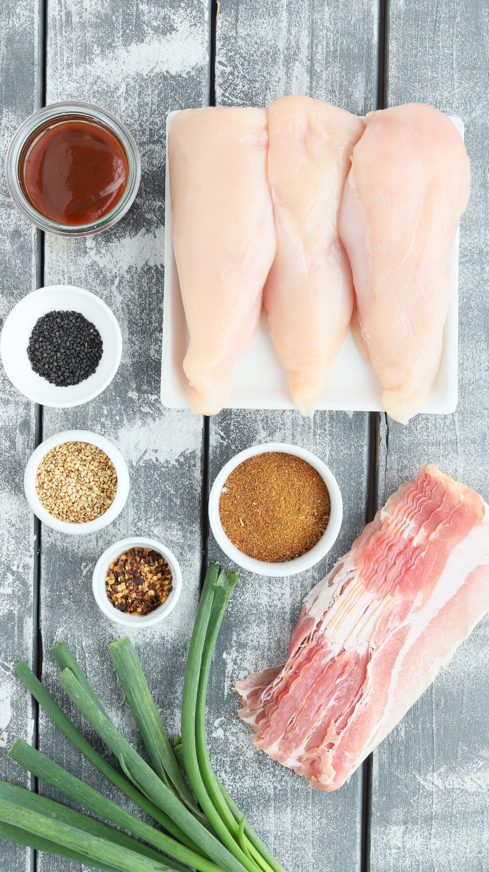 | 7. | Zum Schluss die Hähnchen-Bacon-Spieße mit Sesam, Chili und Lauchzwiebeln anrichten, zugreifen und genießen. Lecker! |