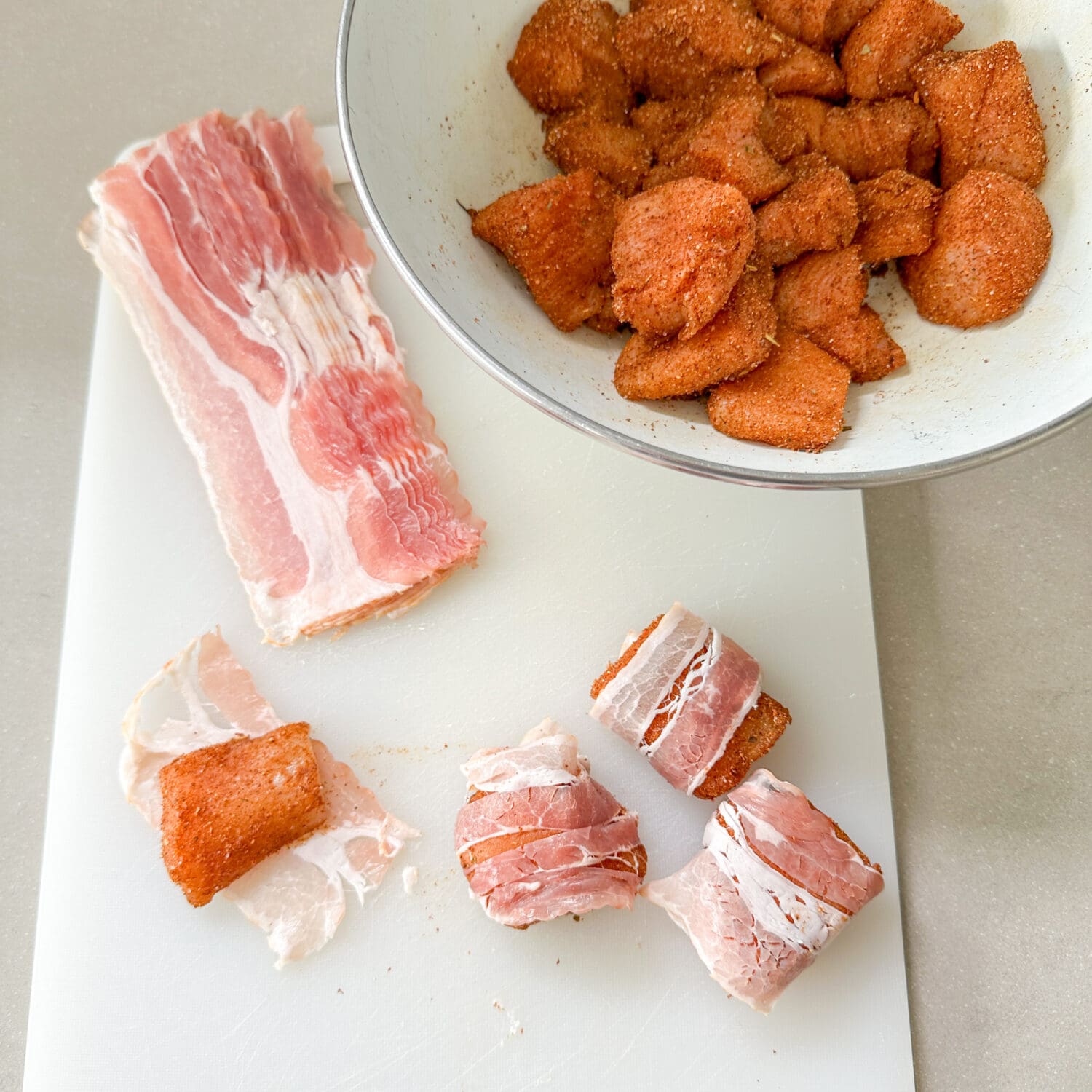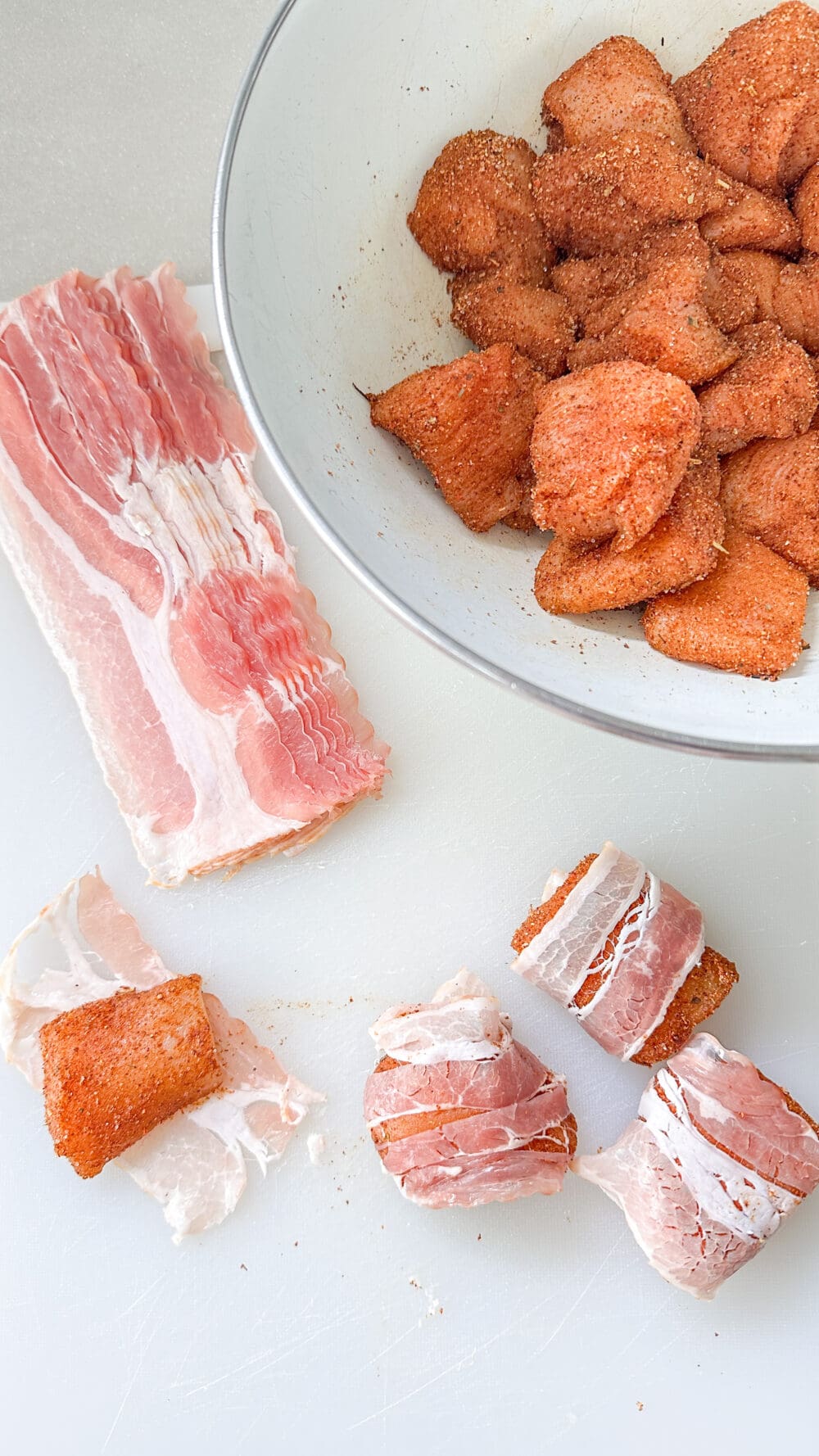 | 3. | Jetzt je einen Hähnchenfiletwürfel in eine halbe Scheibe Bacon einwickeln… |