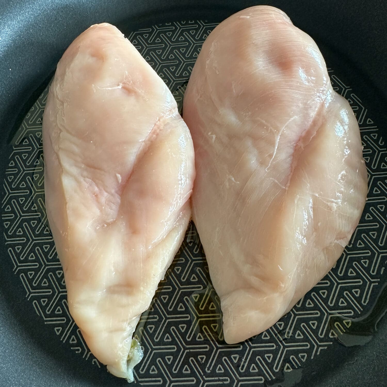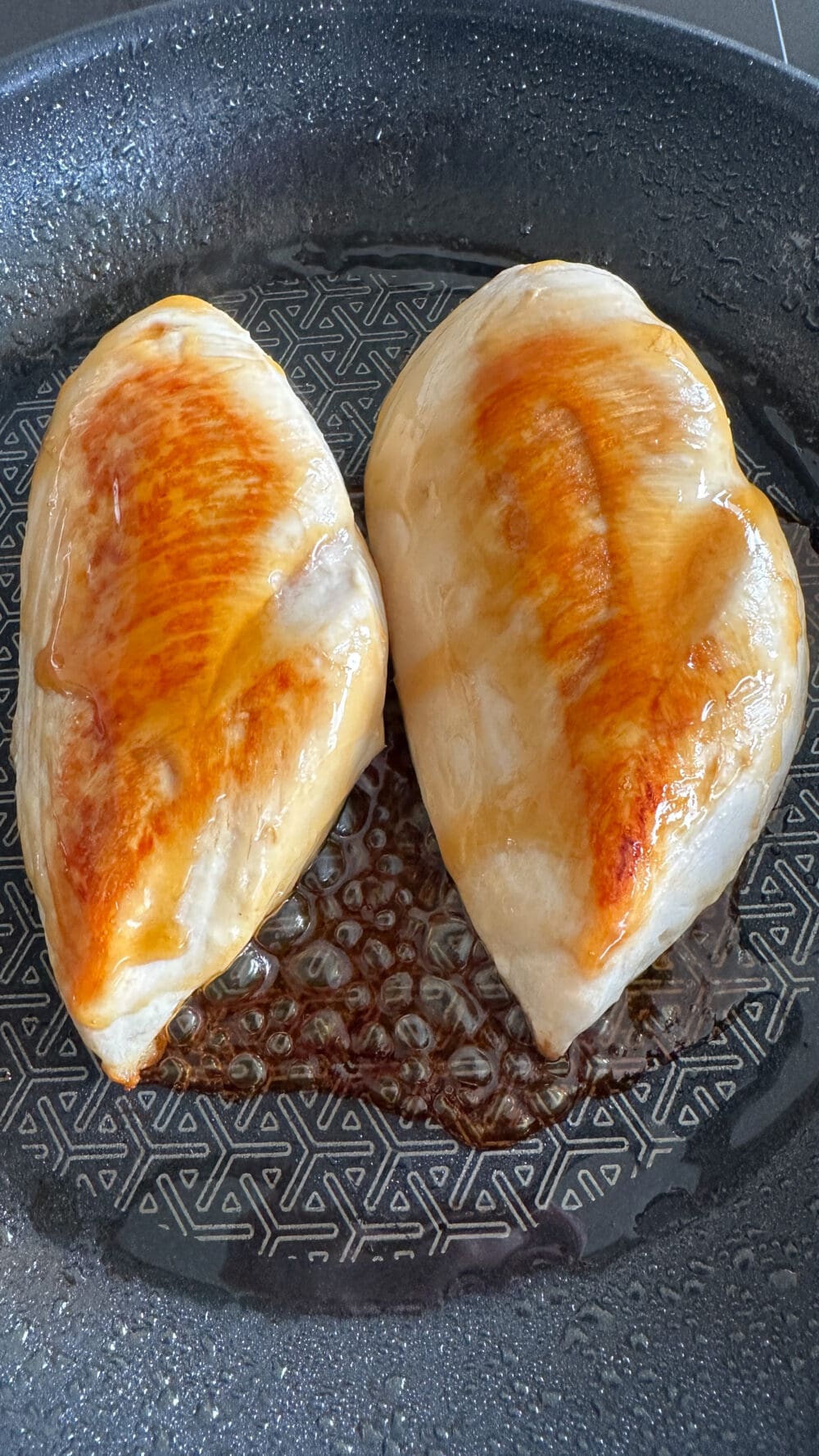 | 2. | Dann die Teriyaki-Sauce zu den Hähnchenfilets in die Pfanne geben… |