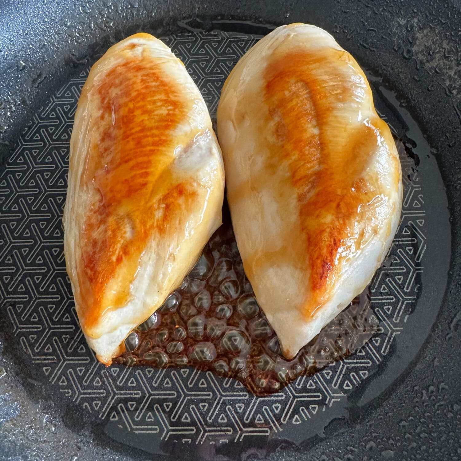 Dann die Teriyaki-Sauce zu den Hähnchenfilets in die Pfanne geben… |