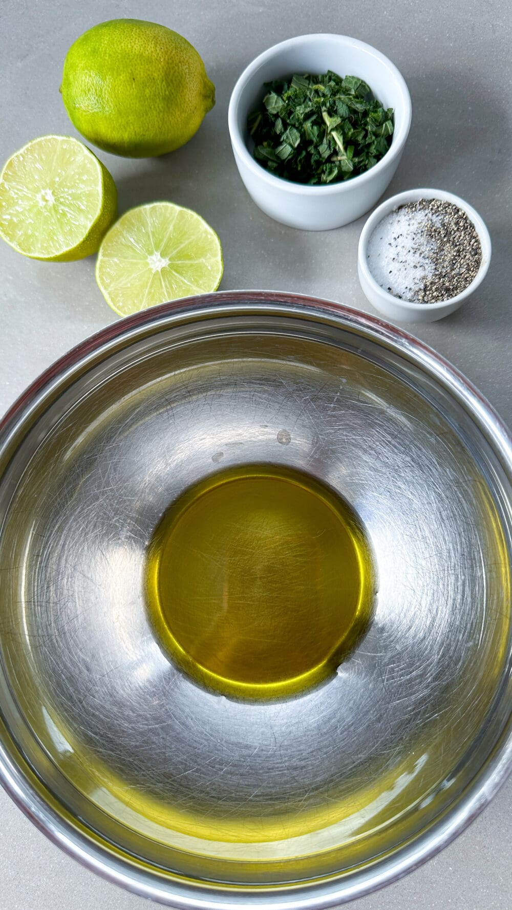 Für das Dressing 2 EL Öl, Limettensaft und Minze mit einer Prise Salz und Pfeffer mischen. |
