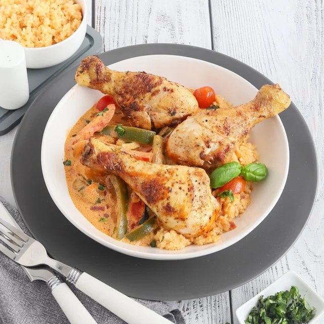 | 8. | Die gebratenen Hähnchenfilets auf das Gemüse legen und alles zusammen im Ofen für circa 35 Minuten bei 180 Grad garen. |