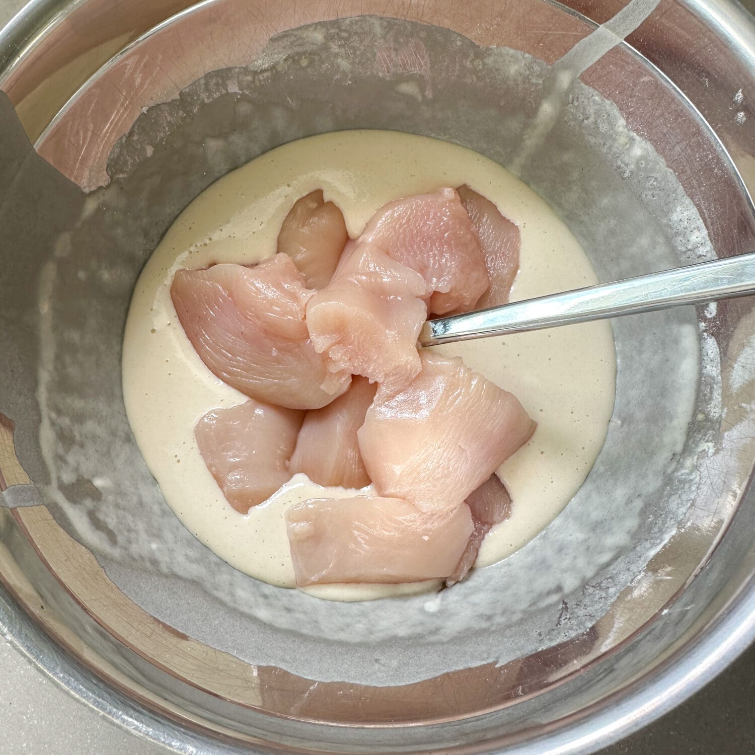 | 2. | Dann die Hähnchenfilets in Stücke schneiden, durch den Teig ziehen, etwas abtropfen lassen… |