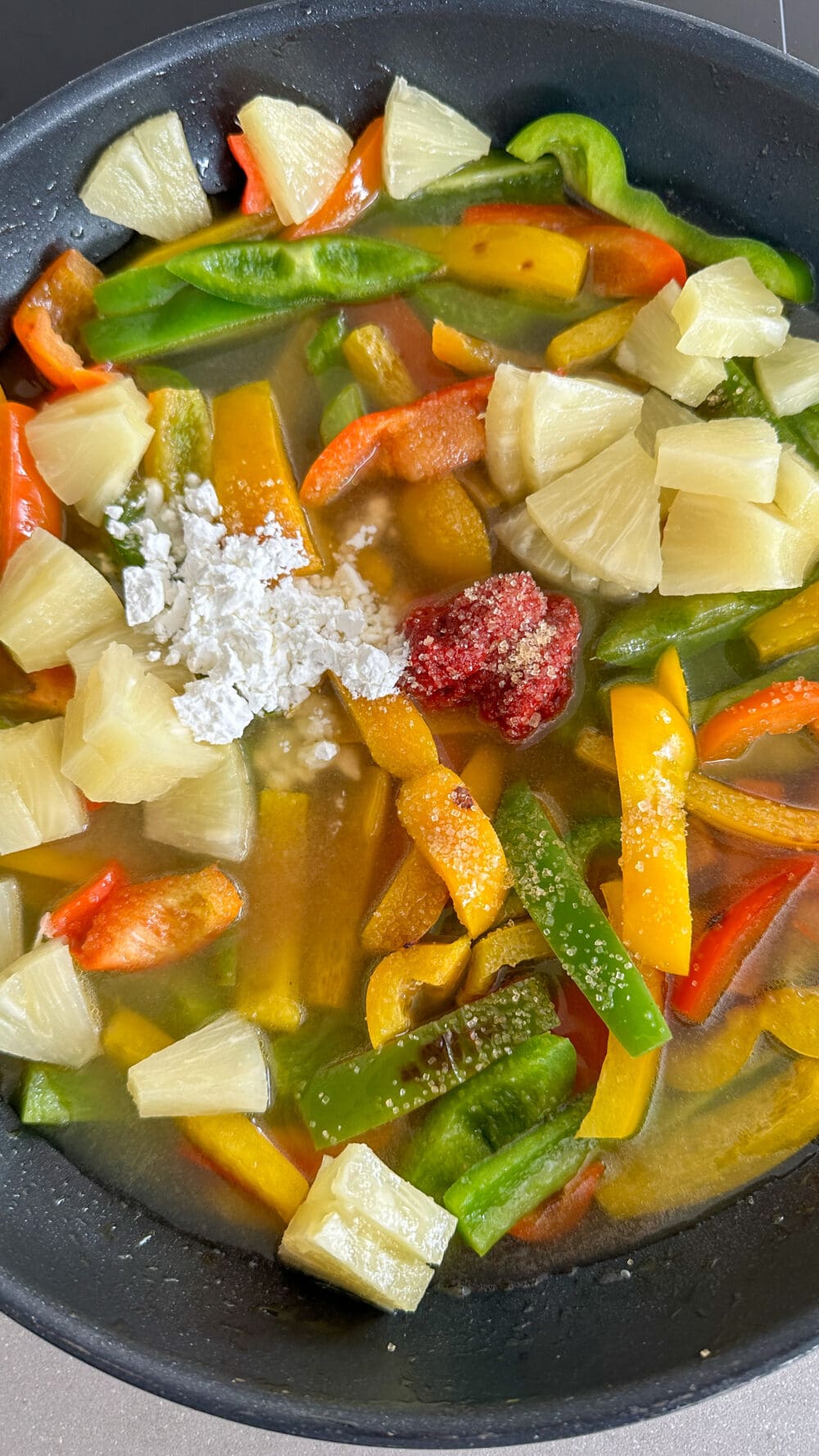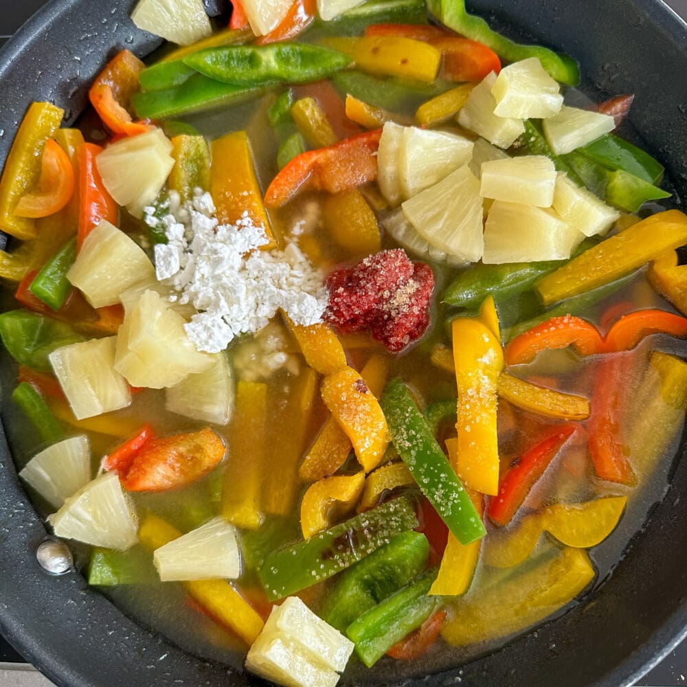 | 5. | …und mit Ananas, Ananassaft, Essig, Zucker, 1 EL Stärke und Tomatenmark circa 10 bis 12 Minuten köcheln lassen. Nebenbei den Reis garen. |