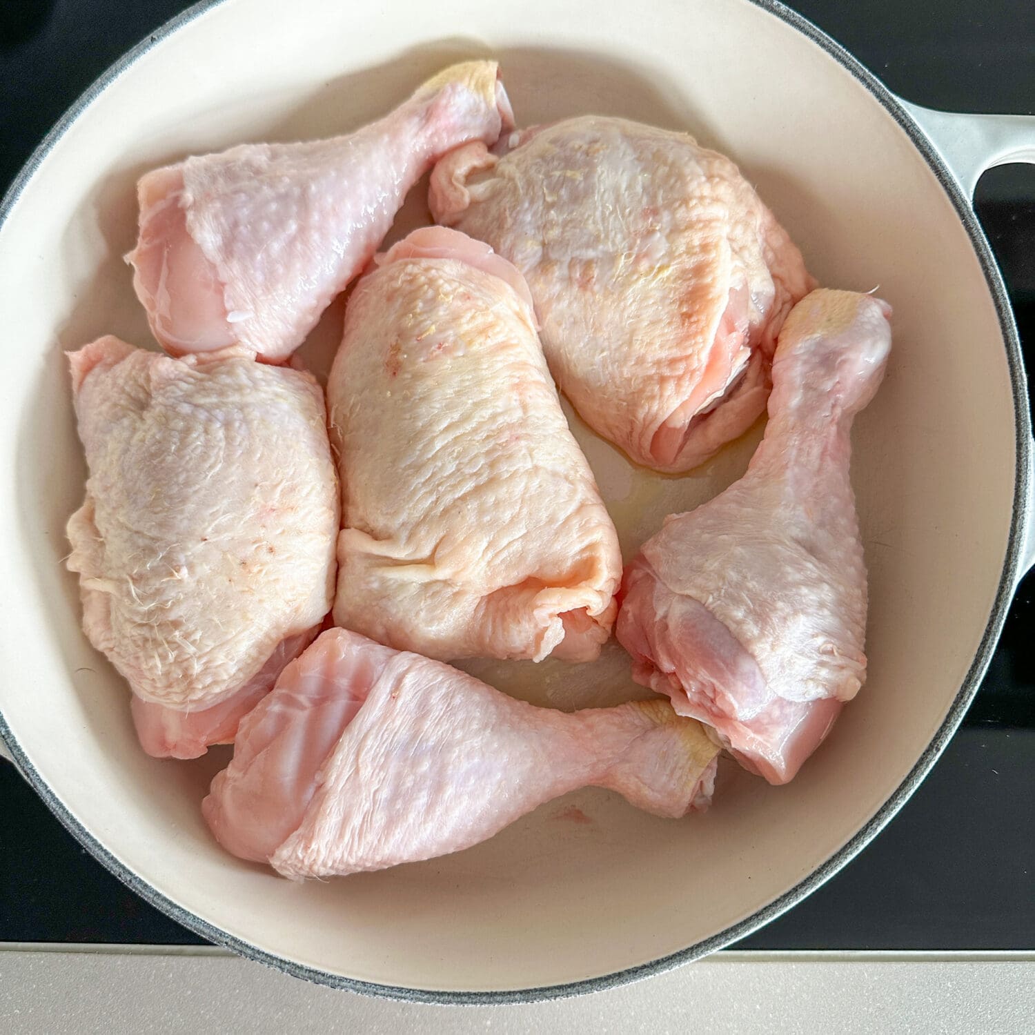 | 6. | Als nächstes die Hähnchenteilstücke in die Sauce geben und für 15 bis 20 Minuten bei mittlerer Hitze und geschlossenem Deckel garen. |