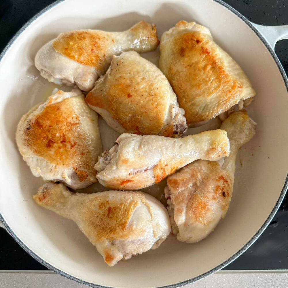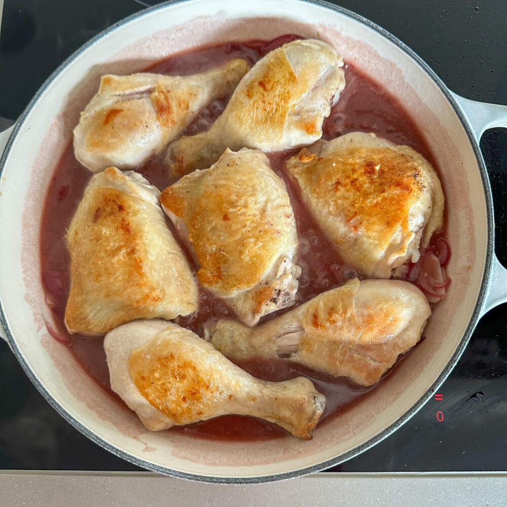 Als nächstes die Hähnchenteilstücke in die Sauce geben und für 15 bis 20 Minuten bei mittlerer Hitze und geschlossenem Deckel garen. |