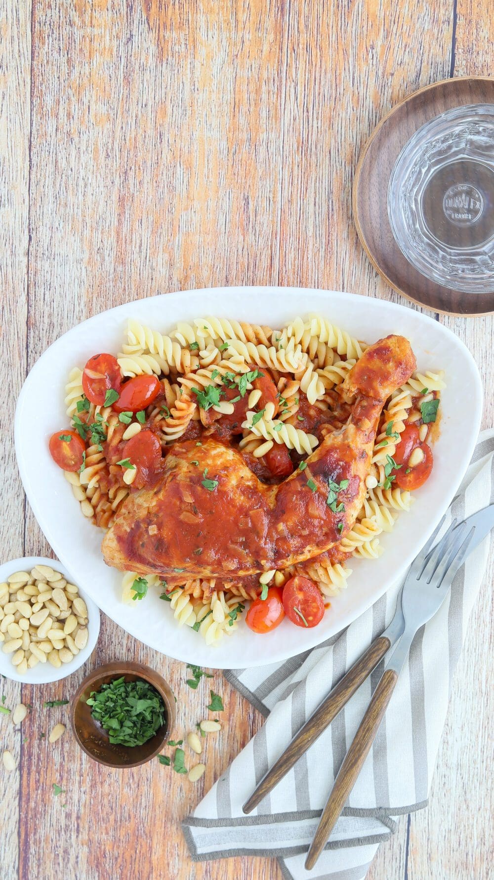 | 8. | Zum Schluss die Hähnchenschenkel in Tomatensauce mit der Pasta anrichten und mit Pinienkernen und Petersilie genießen. |