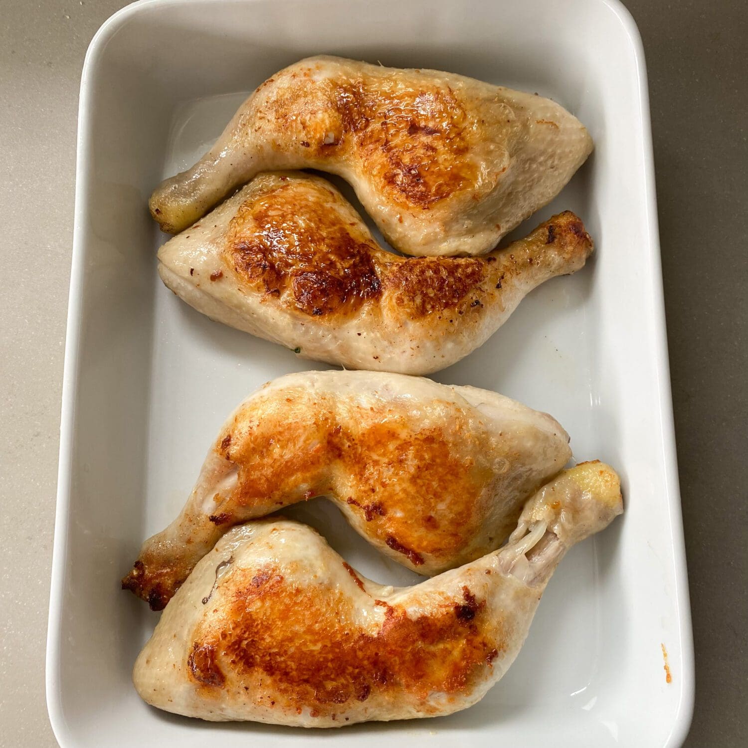 | 6. | Nun die Sauce über die Hähnchenschenkel geben und 45 Minuten bei 180 Grad garen. Nebenbei die Pasta kochen. |