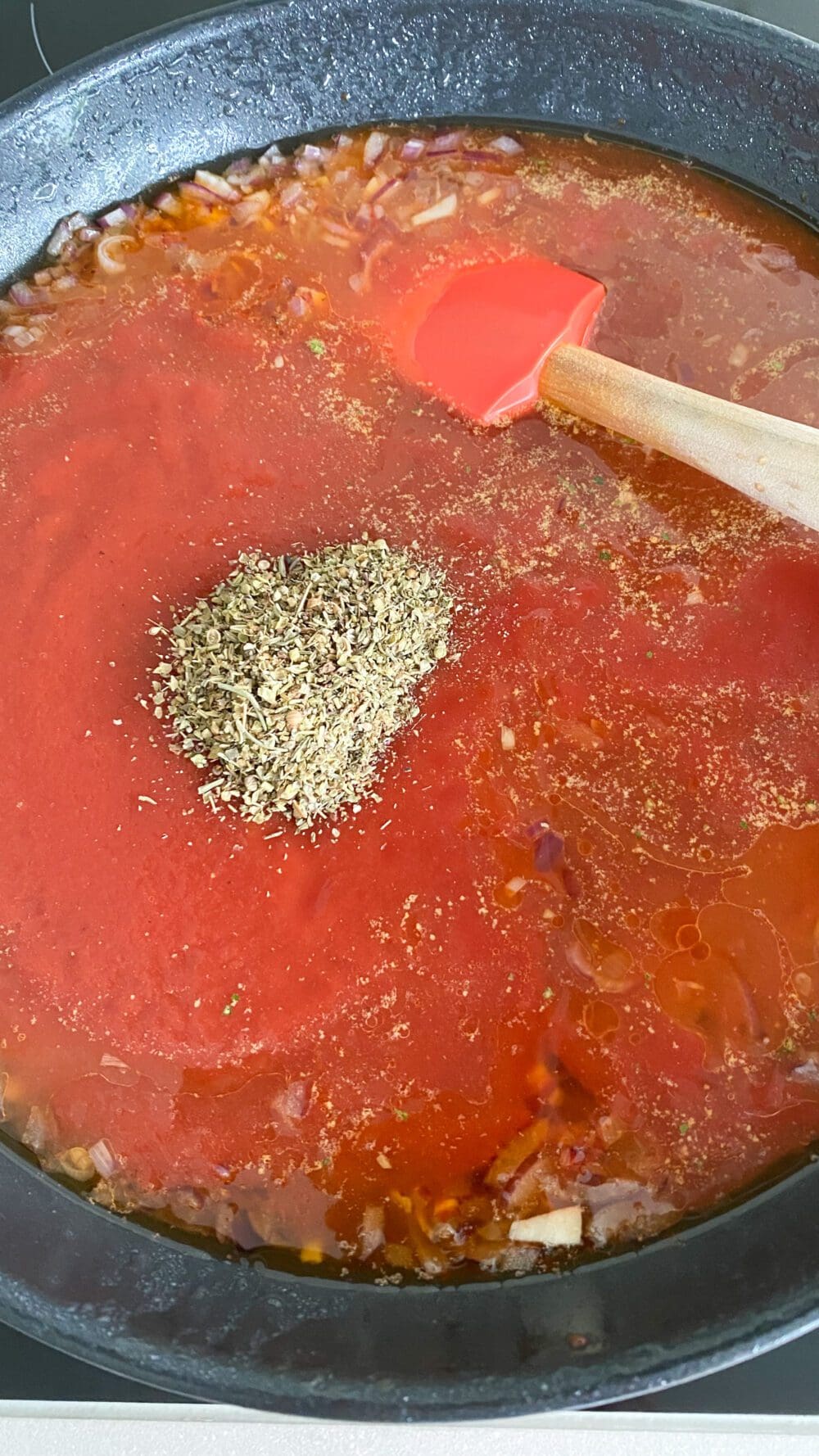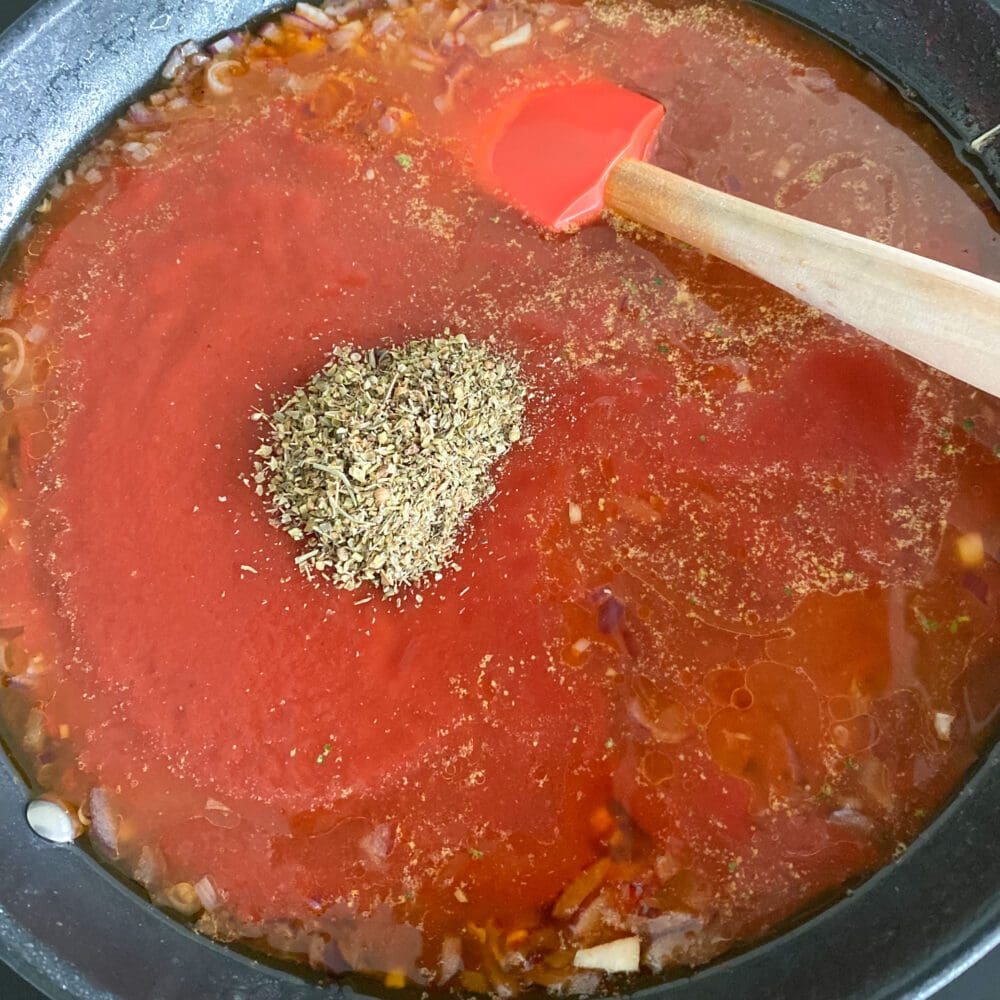 | 5. | Nach ein paar Minuten passierte Tomaten, Brühe und italienische Kräuter untermischen und alles mit Salz und Pfeffer abschmecken. |