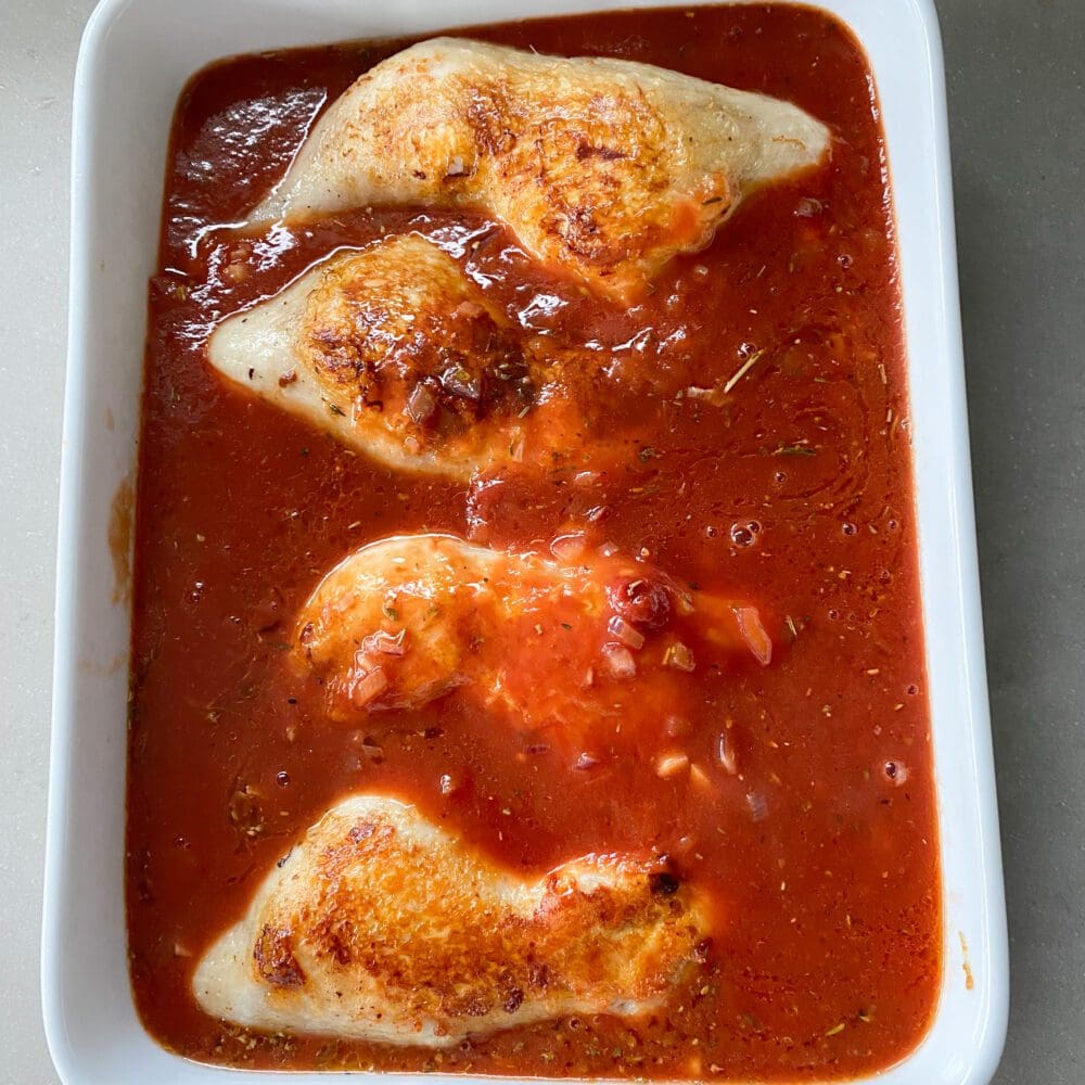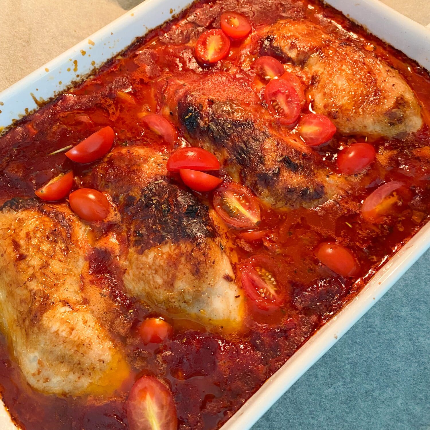 Hähnchenschenkel in Tomatensauce mit Pasta