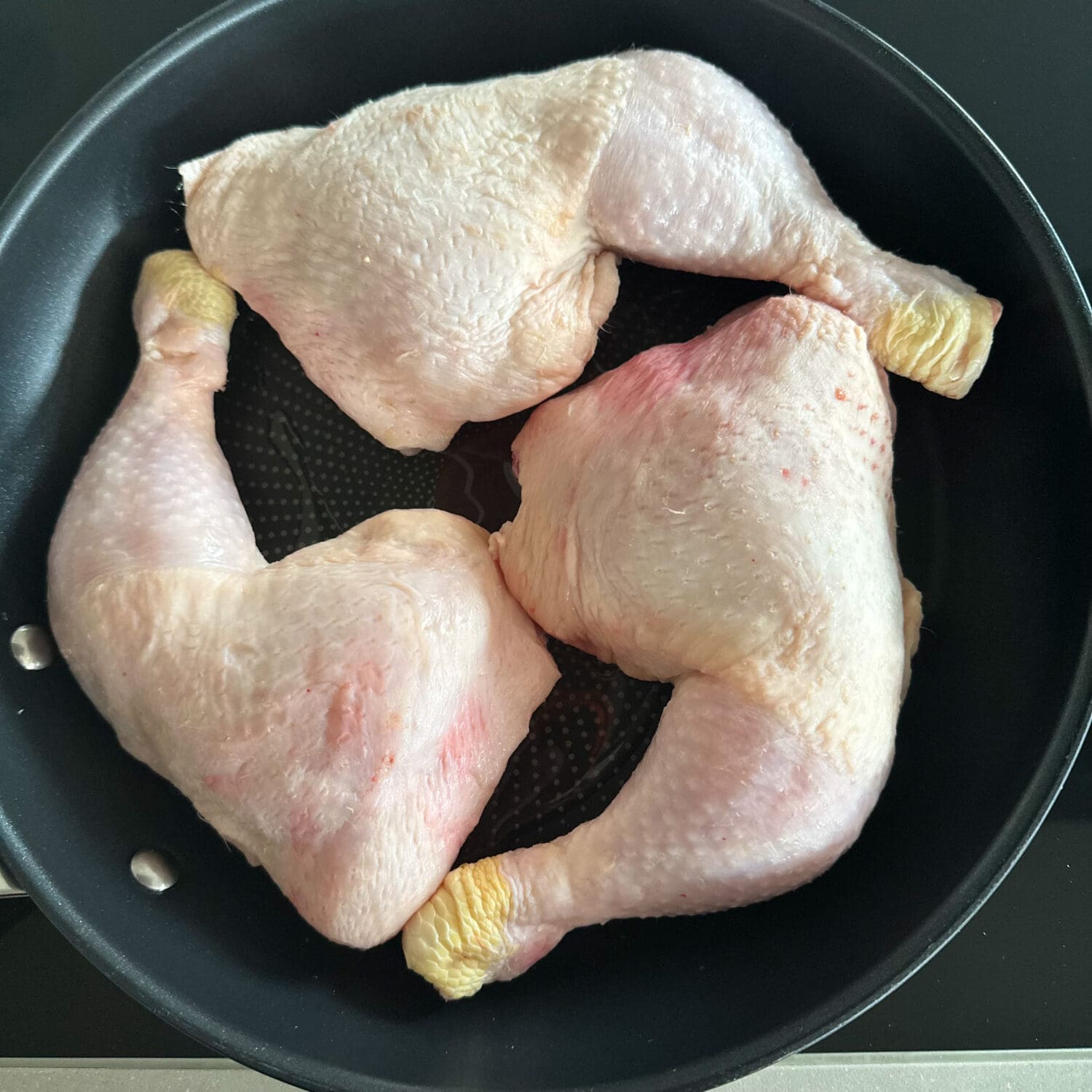 Die Hähnchenschenkel wieder in die Pfanne geben und alles bei geschlossenem Deckel und mittlerer Hitze circa 35 Minuten garen. |
