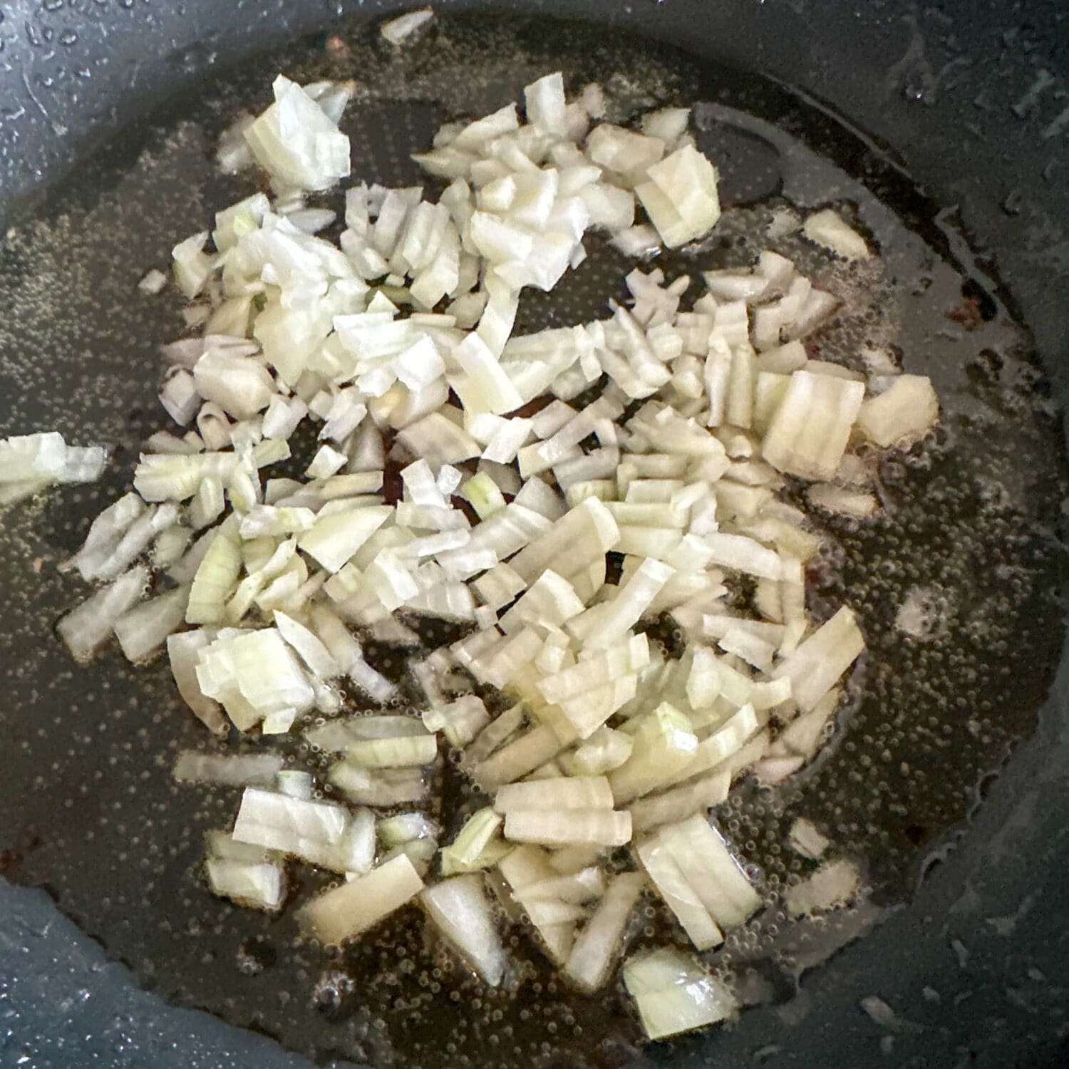 Dann die klein gehackten Zwiebeln in dem Bratfett glasig anschwitzen. |