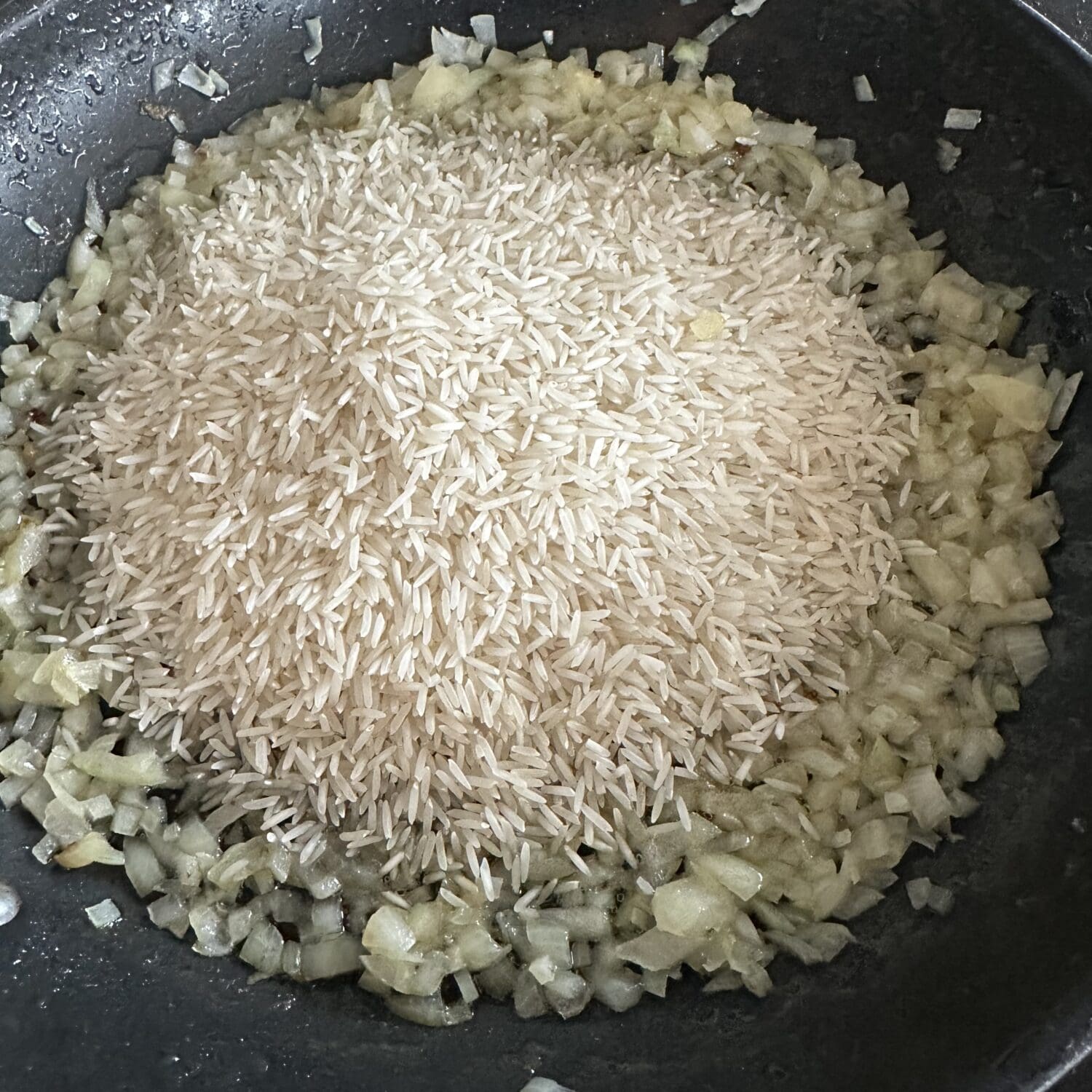 | 4. | Und den Reis für 2 bis 3 Minuten mit anbraten. |