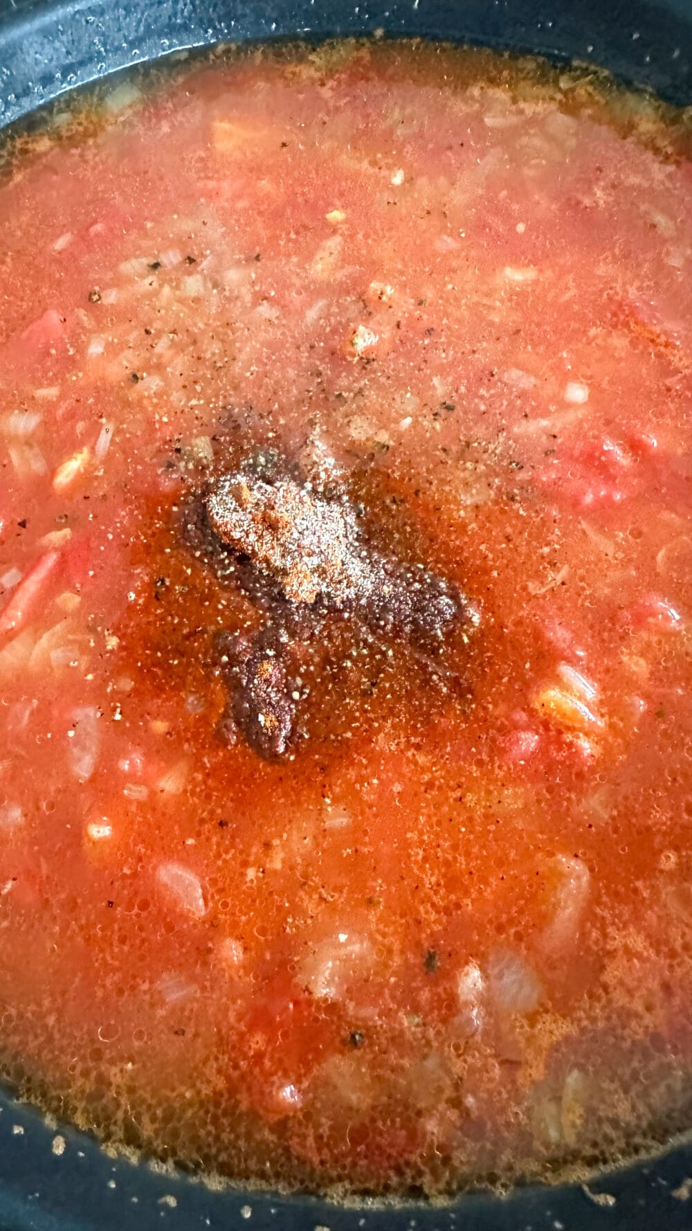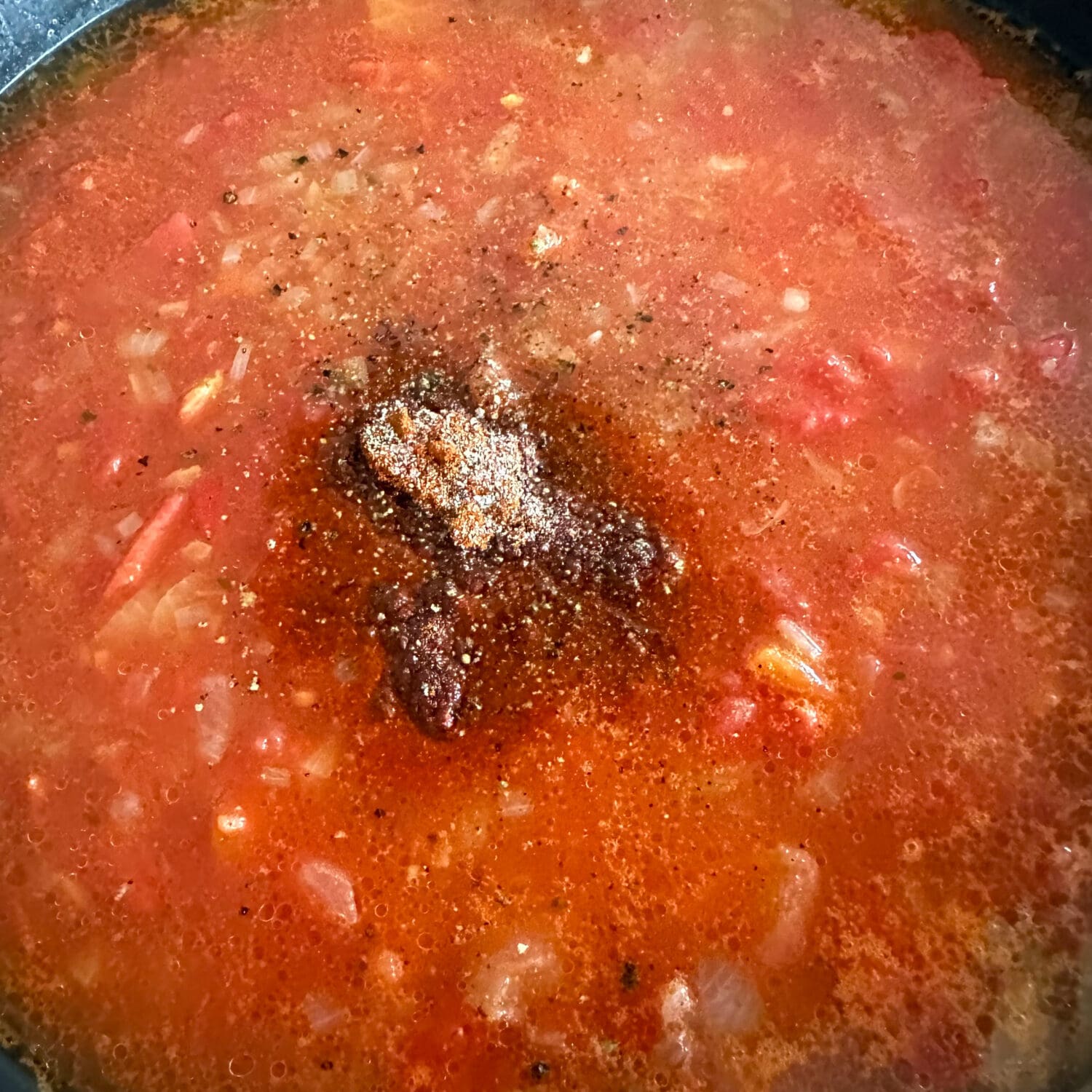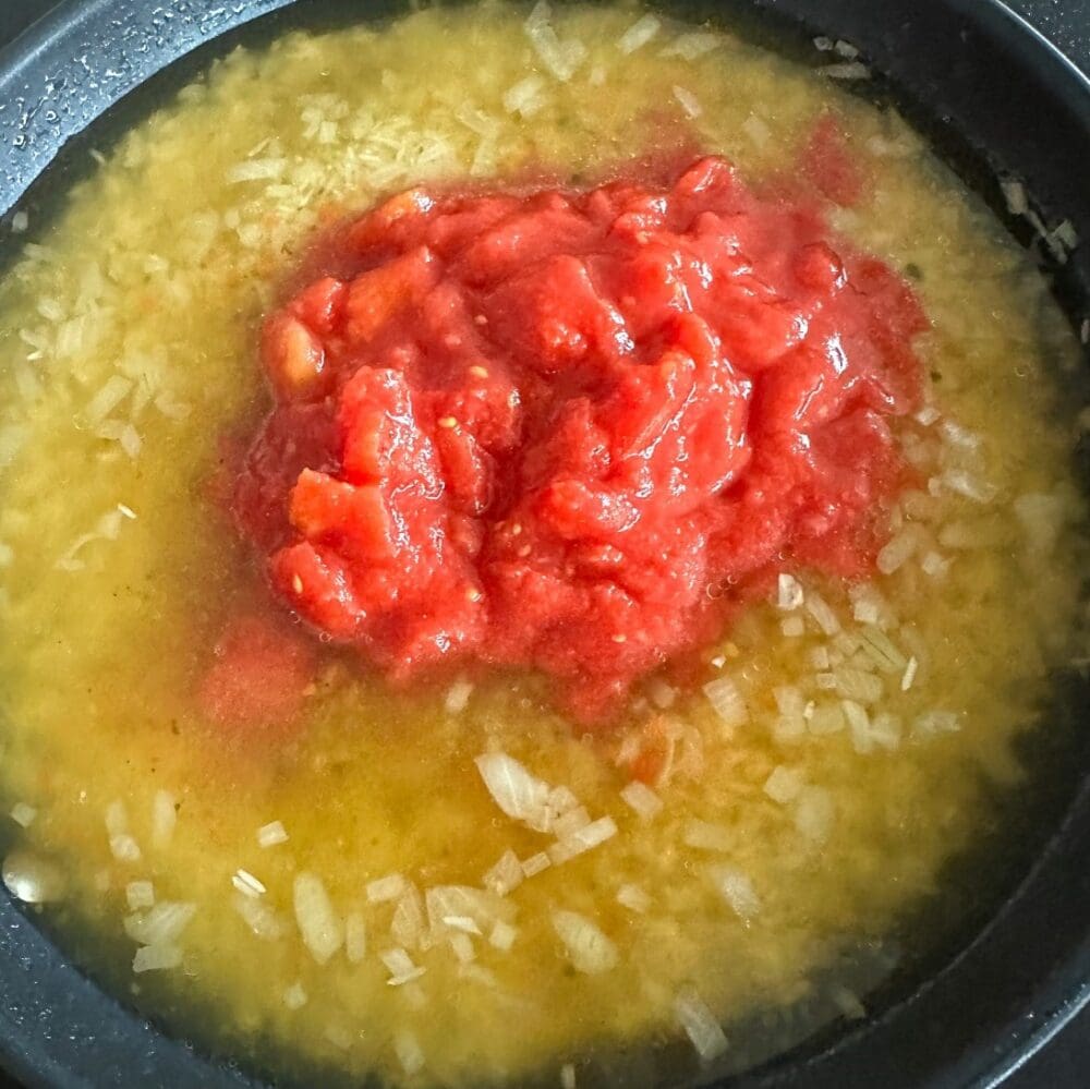 Anschließend Brühe und Tomaten unterrühren und aufkochen. |