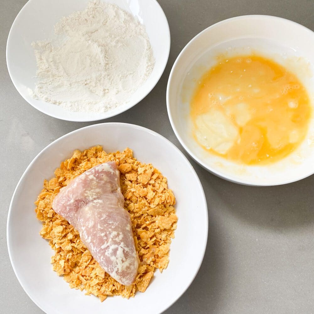| 5. | Danach die Nacho-Putenfilets in 2 EL Öl von jeder Seite 5 bis 7 Minuten anbraten, bis sie goldbraun sind. |