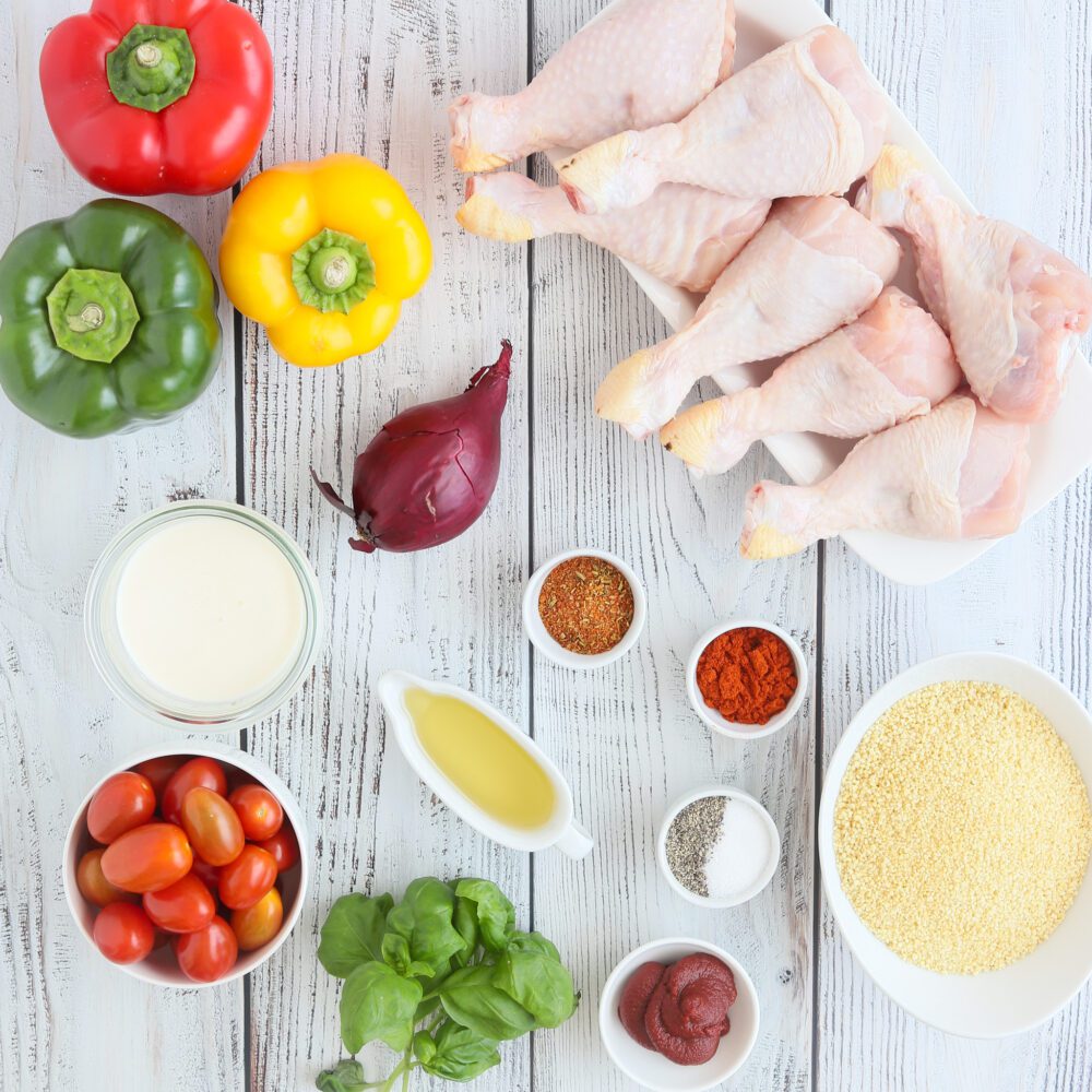| 7. | Zum Schluss die Hähnchenunterschenkel noch einmal dazugeben, alles kurz aufkochen, mit Basilikum toppen und mit Couscous genießen. |