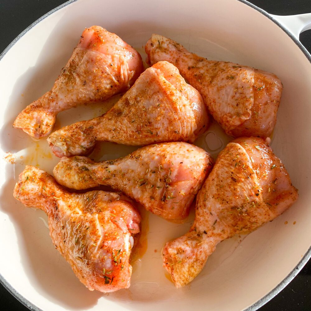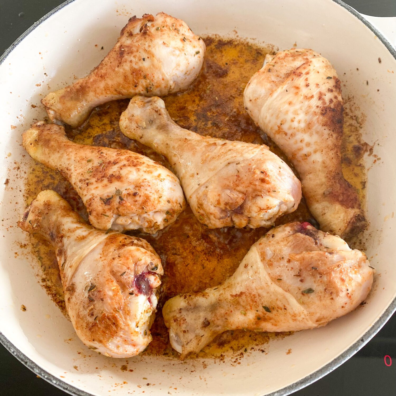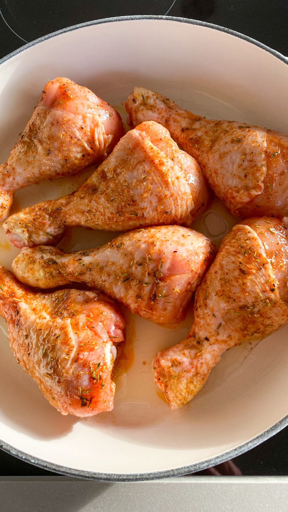 Zunächst die Hähnchenunterschenkel rundherum mit dem Geflügelgewürz bestreichen und in 3 EL Öl von allen Seiten circa 10 bis 12 Minuten scharf anbraten… |