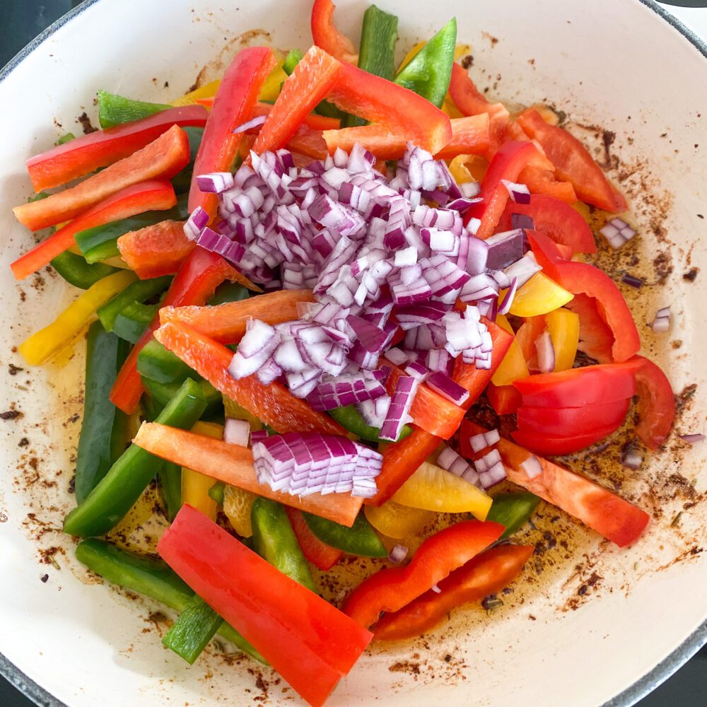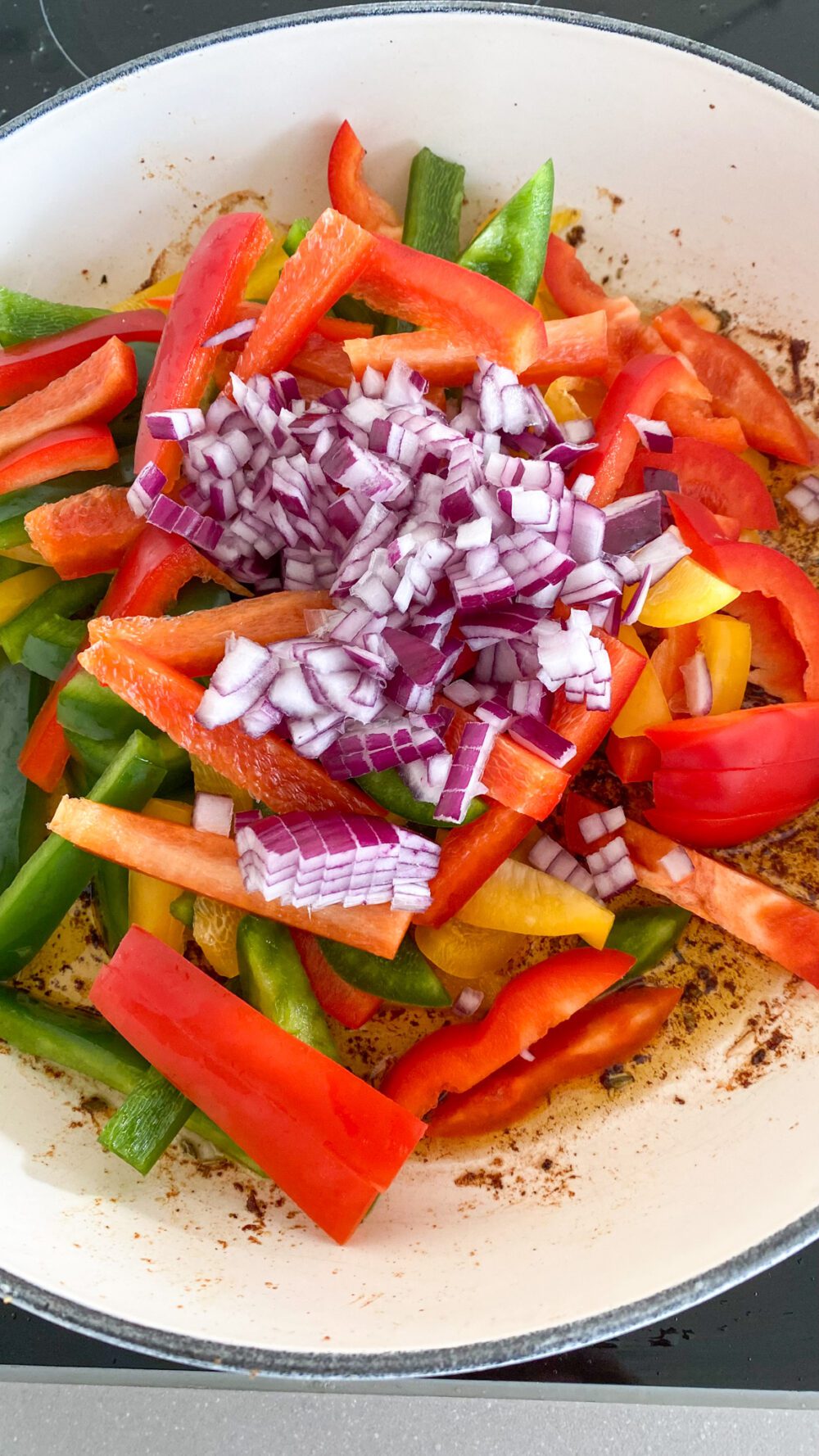 | 3. | Jetzt die Zwiebel schälen und würfeln. Zusammen mit der geschnittenen Paprika in dem Bratfett circa 3 bis 5 Minuten anrösten. |