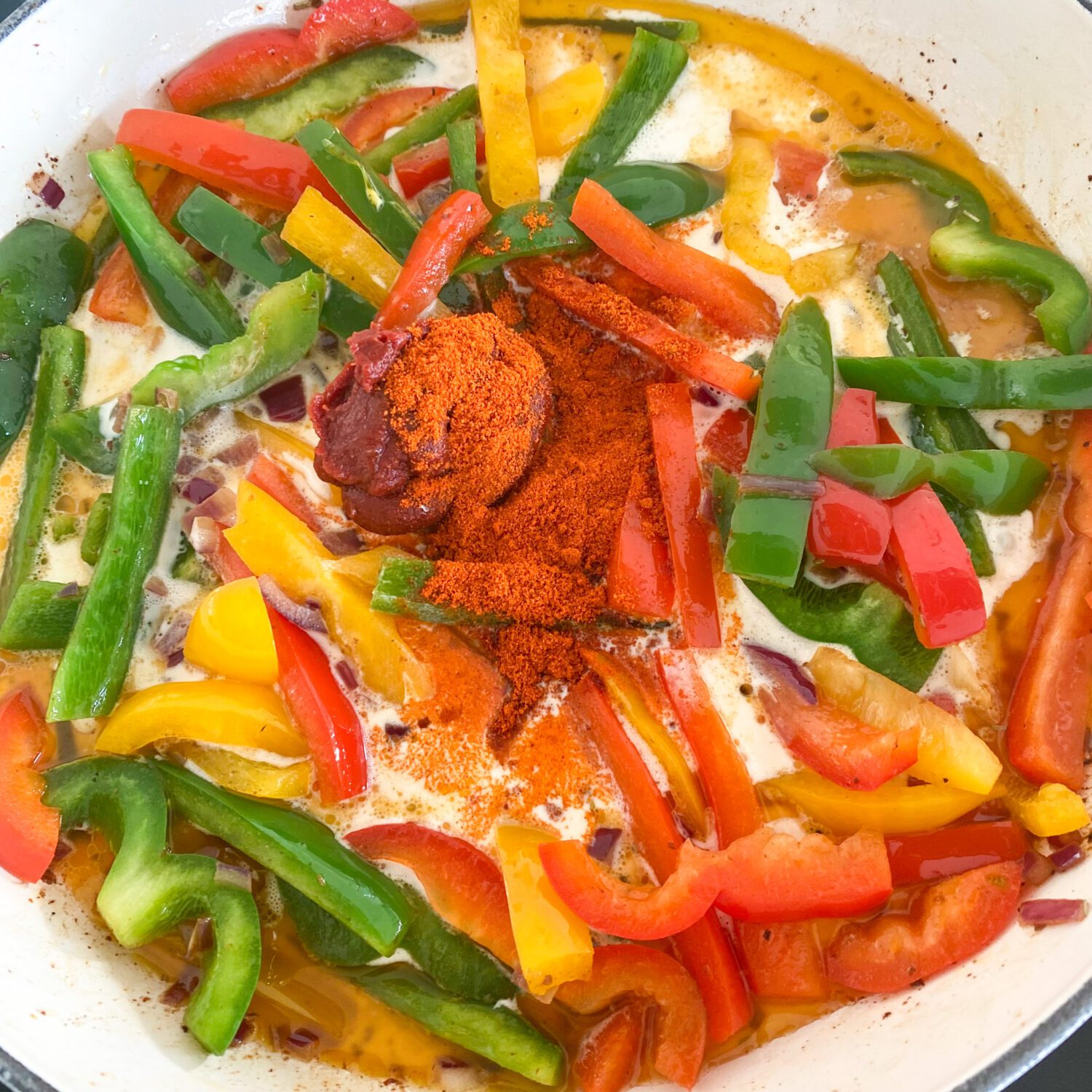 | 4. | Dann Sahne, Tomatenmark und 2 TL Paprikapulver hinzugeben und 10 bis 12 Minuten köcheln lassen. |