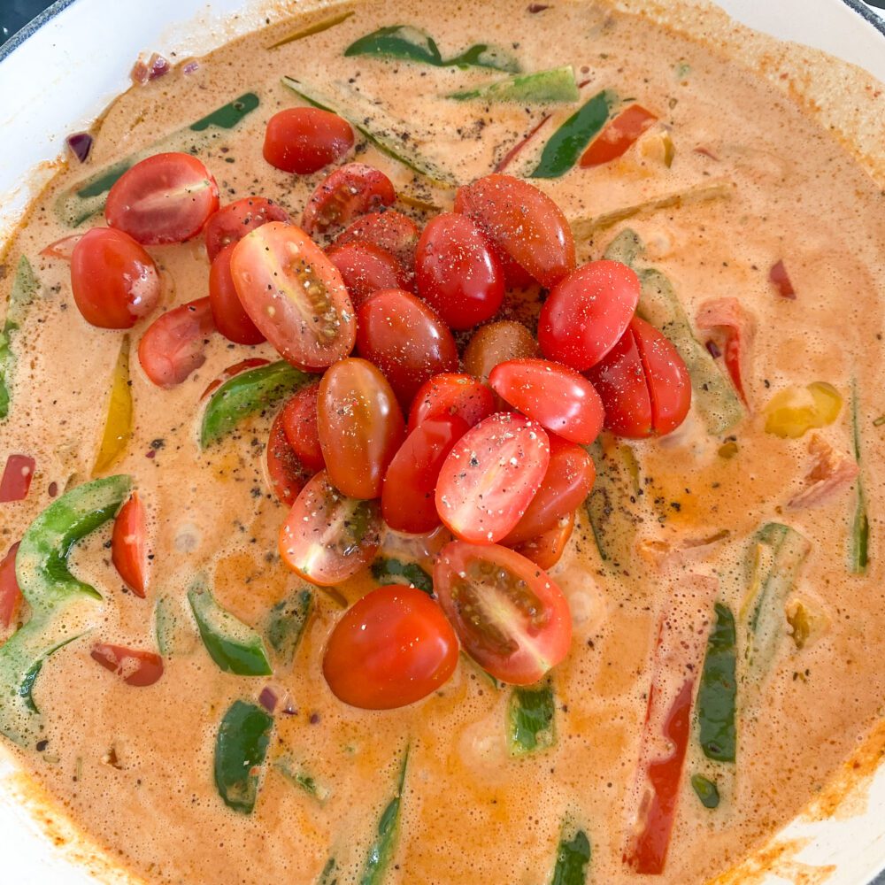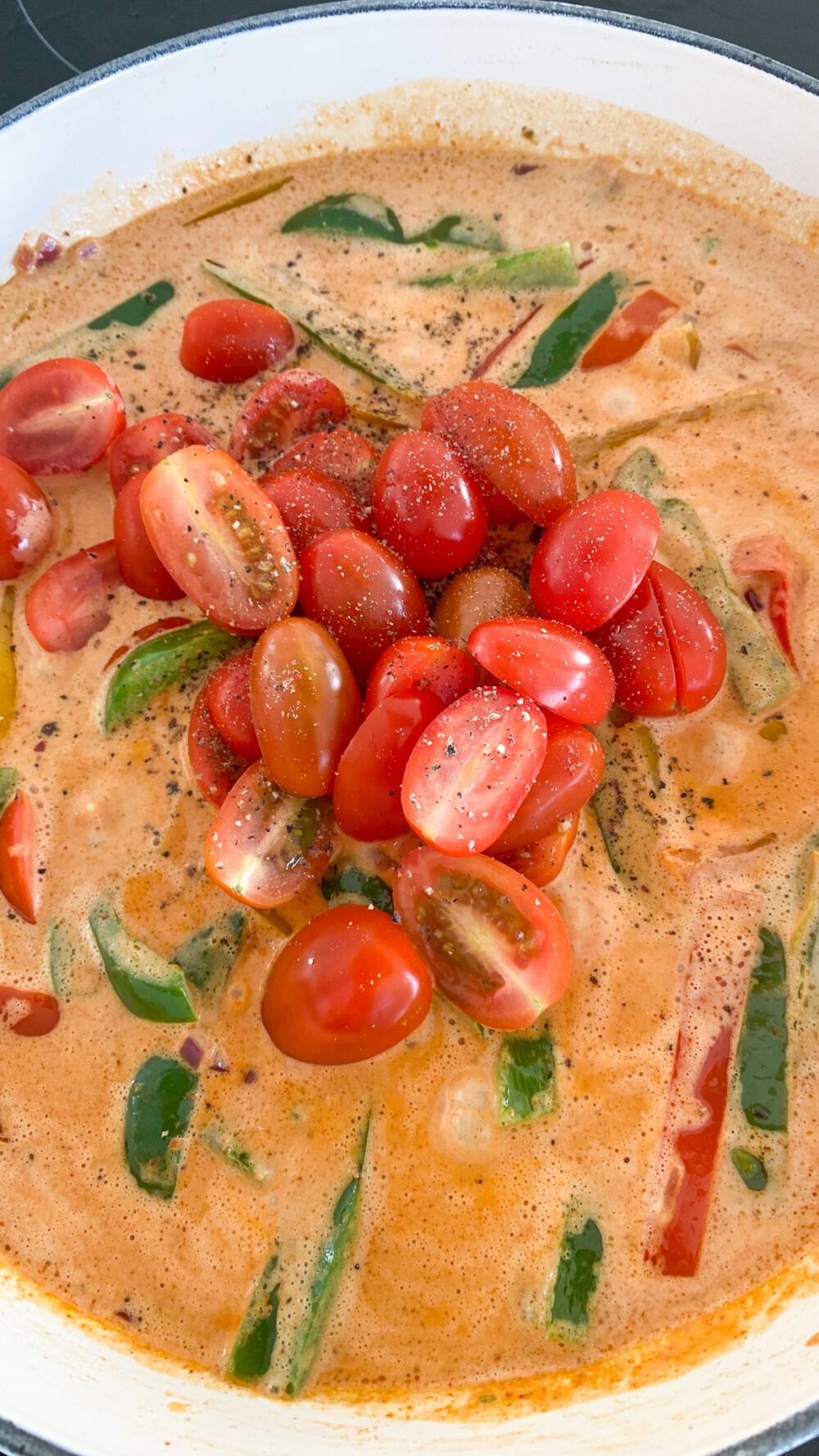 Anschließend die Tomaten halbieren und zu der Paprika in die Pfanne geben. Zusammen weitere 3 bis 5 Minuten köcheln lassen und mit Salz und Pfeffer abschmecken. |