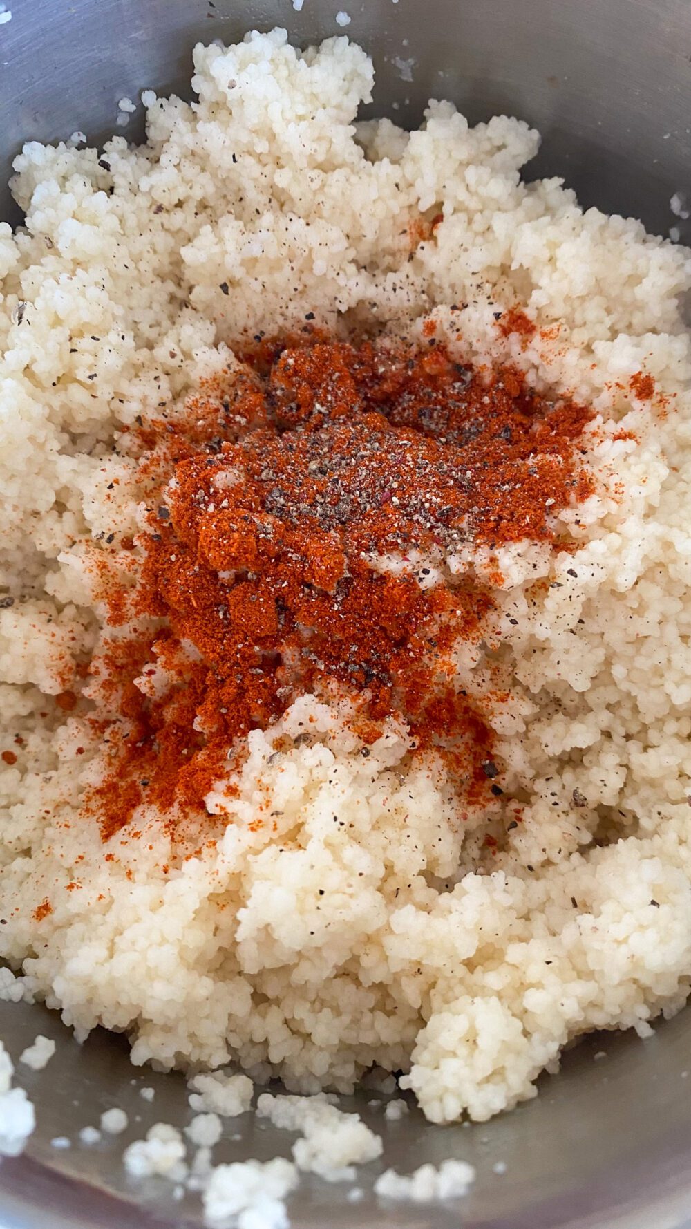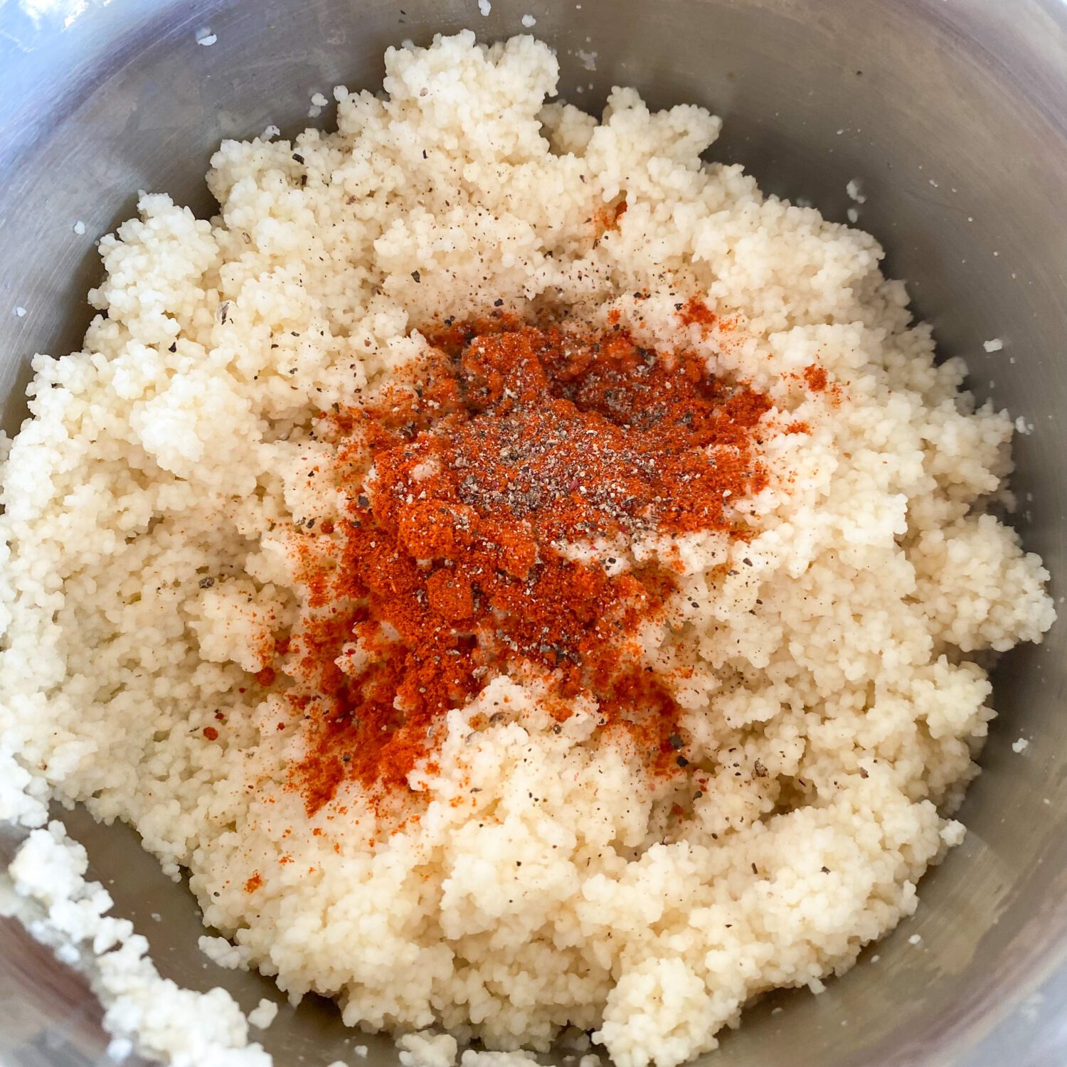 Als nächstes den Couscous nach Packungsangabe zubereiten, 2 EL Öl und 1 TL Paprikapulver unterrühren. |