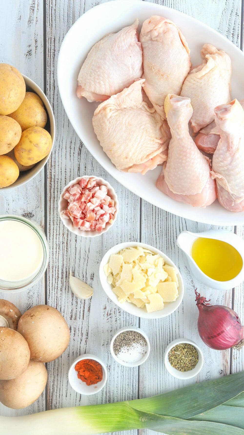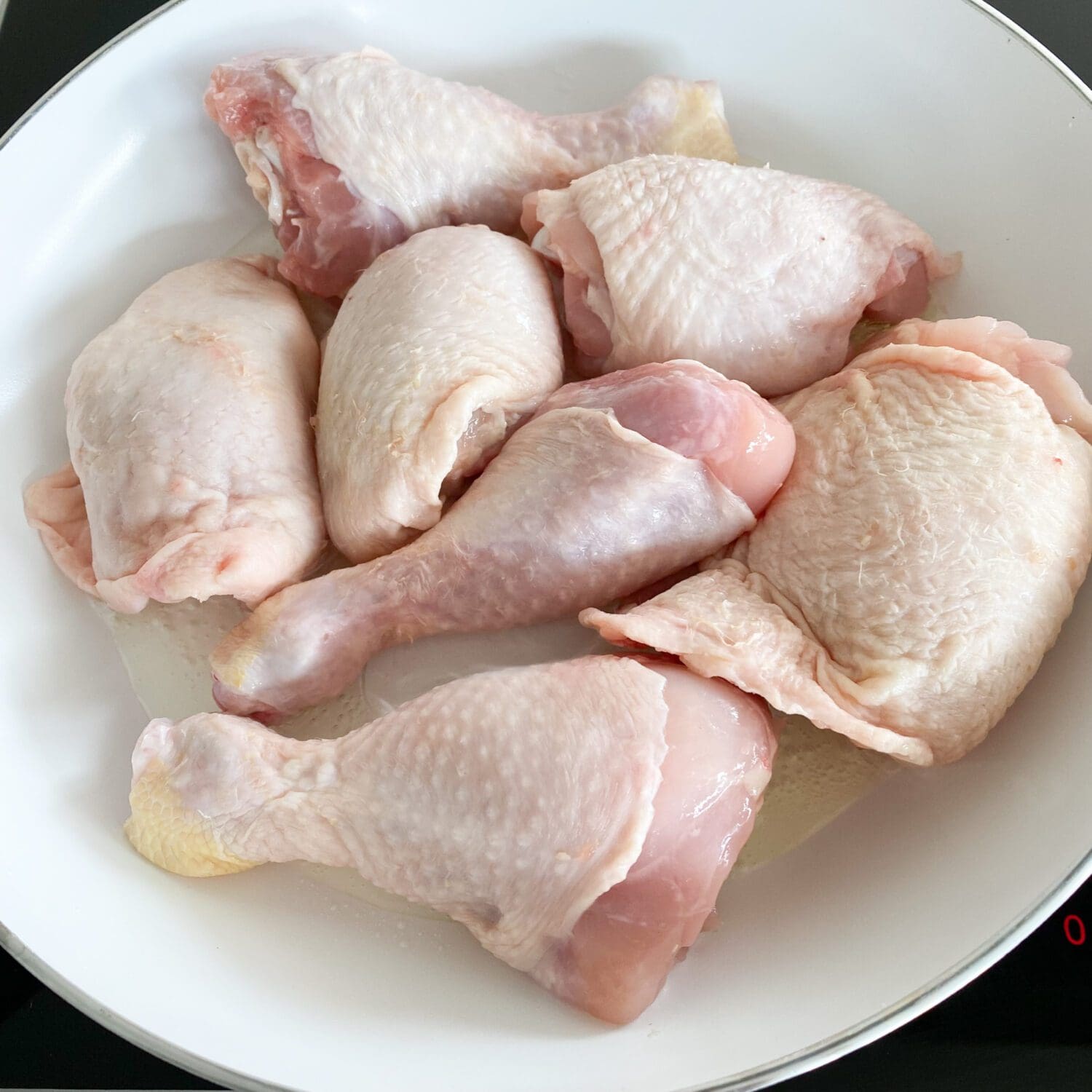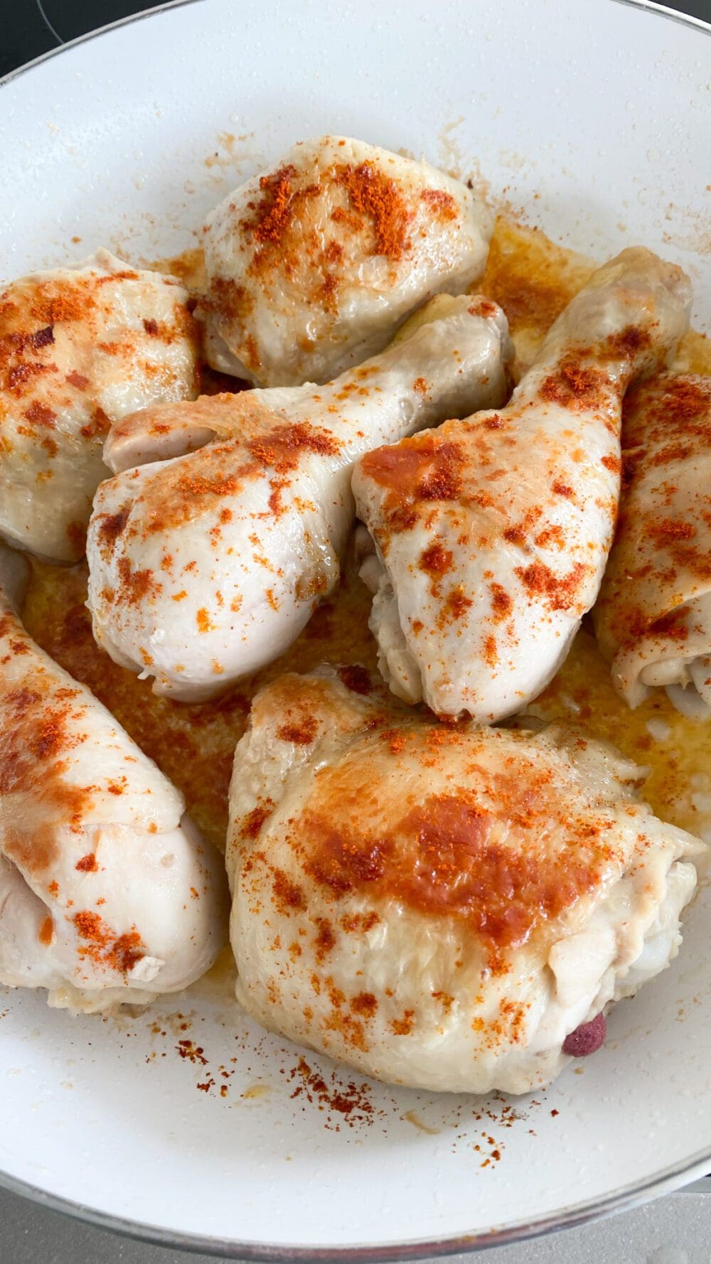 | 3. | Die Hähnchenober- und unterkeulen mit Paprika und Salz und Pfeffer würzen. Kurz zur Seite stellen. |