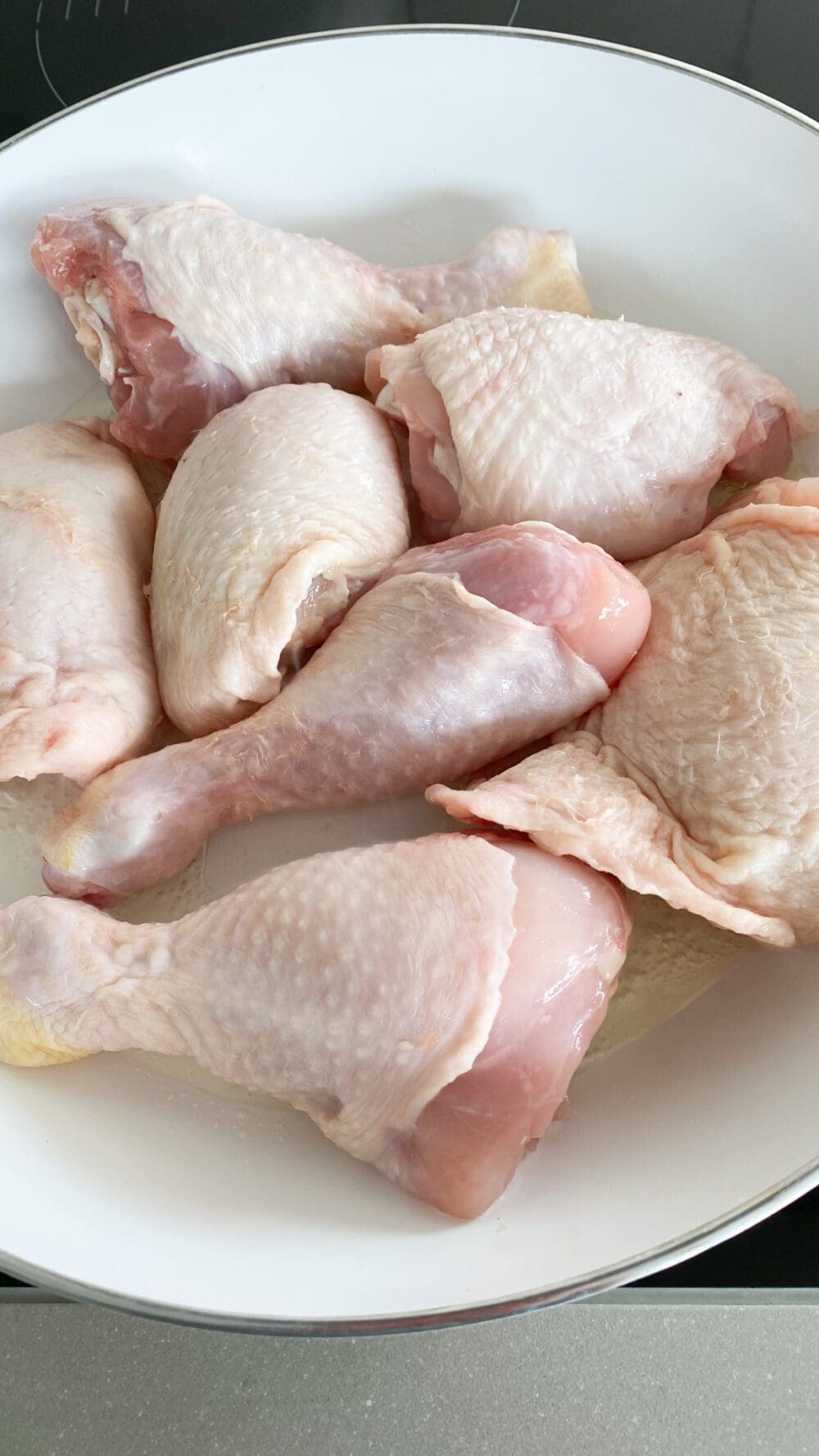 | 7. | …die Hähnchenober- und -unterkeulen in die Sauce geben und alles für circa 25 bis 30 Minuten bei geschlossenem Deckel zu Ende garen. |