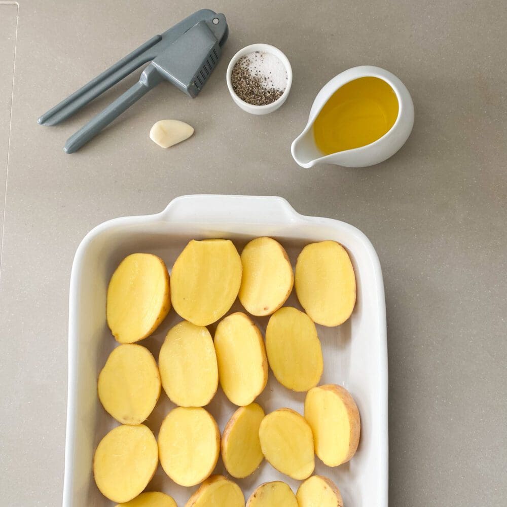 Die Kartoffeln putzen, halbieren, mit restlichem Öl, Knoblauch und etwas Salz und Pfeffer mischen und bei 180 Grad im Ofen circa 35 bis 45 Minuten garen. |