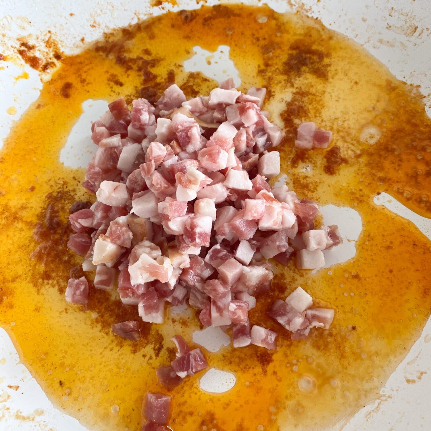 Den gewürfelten Bacon in dem Bratfett anbraten. |