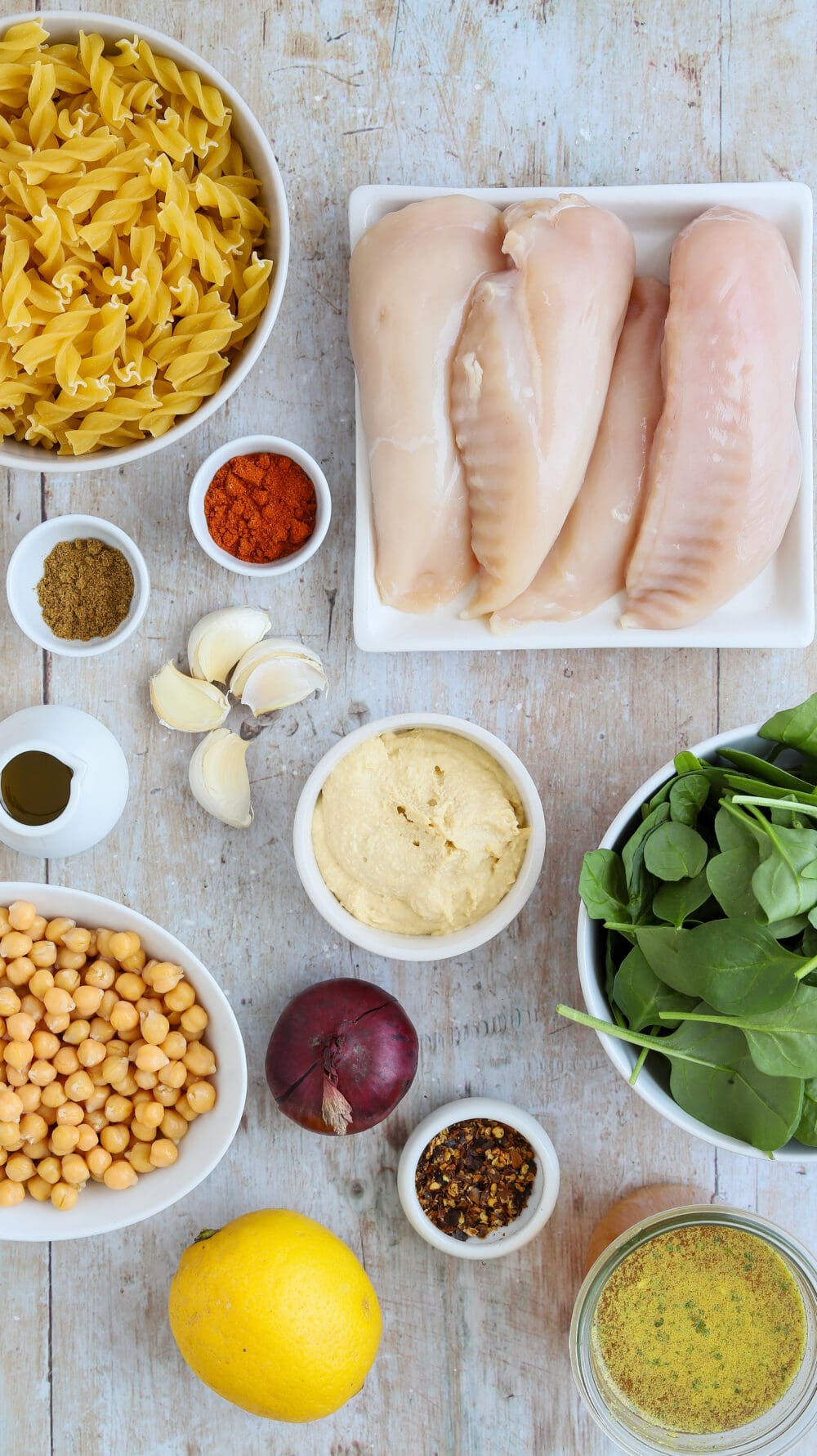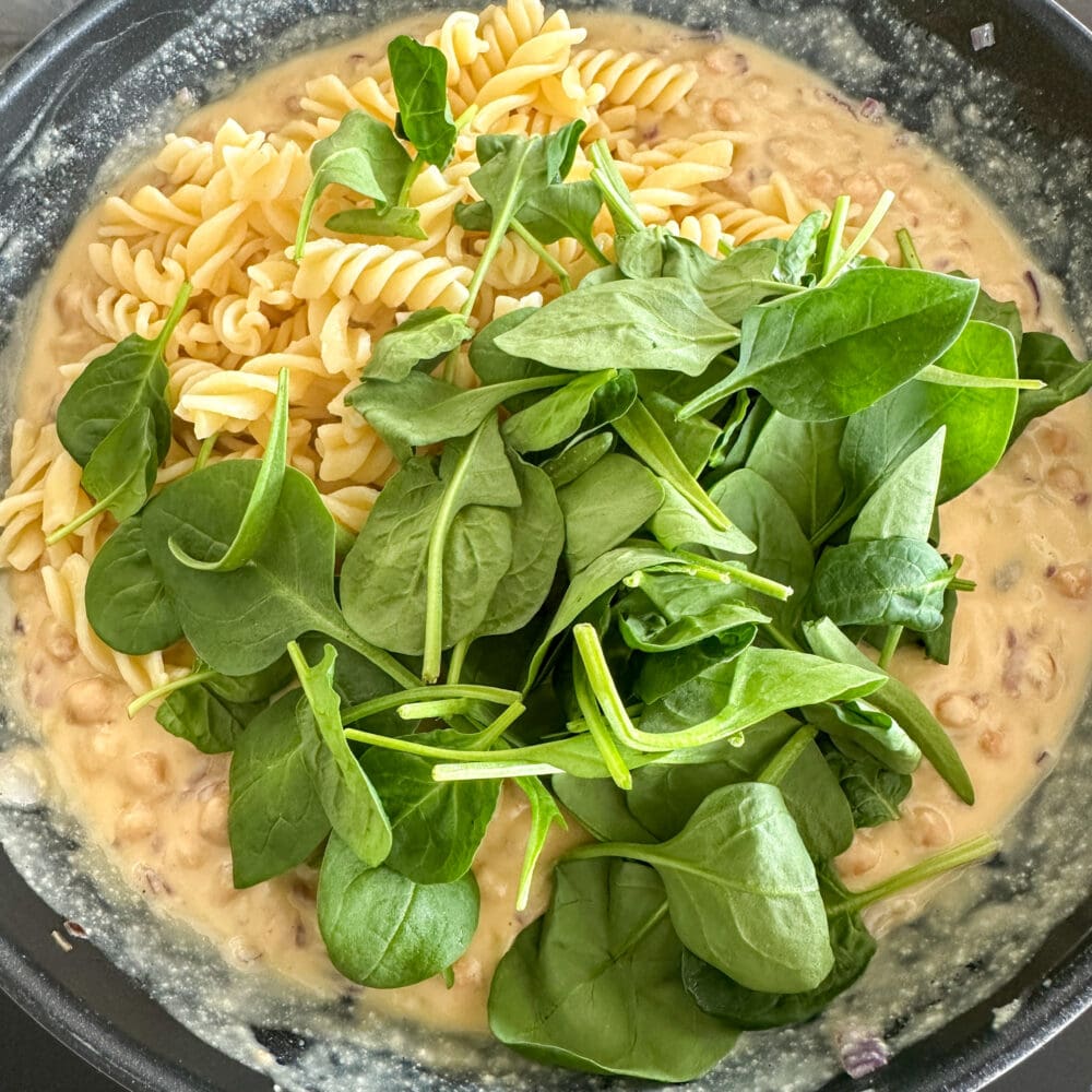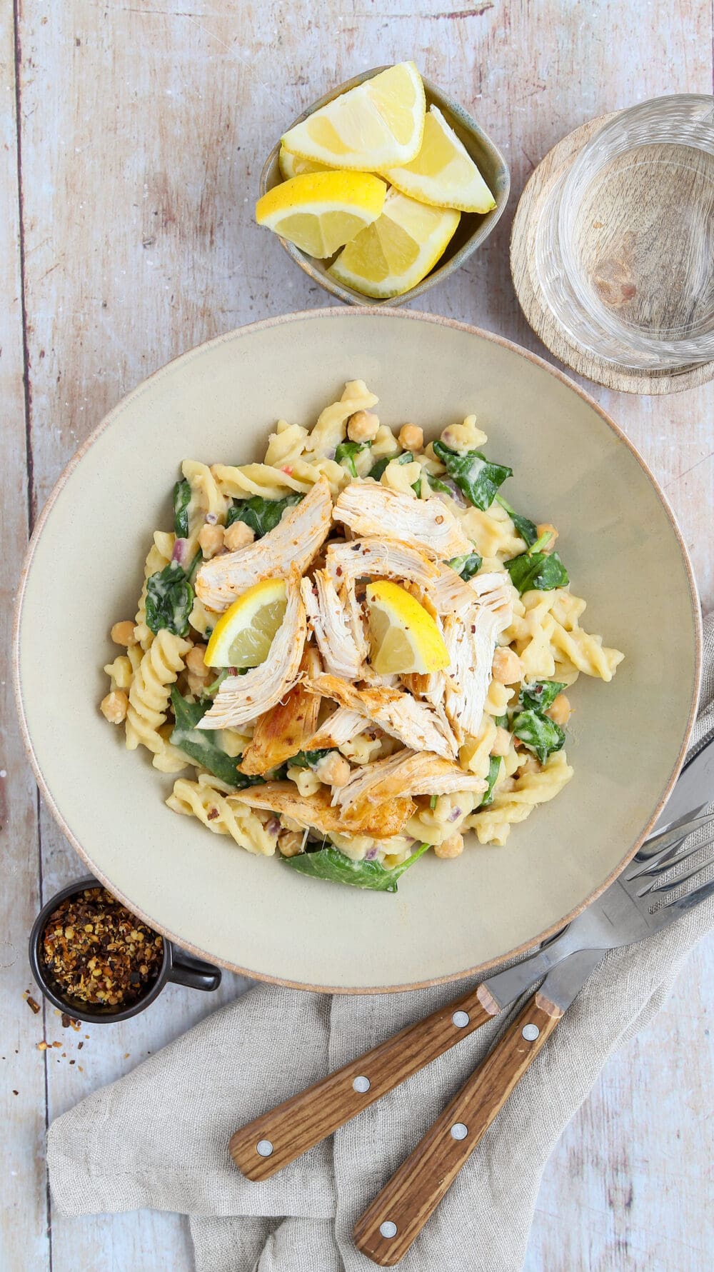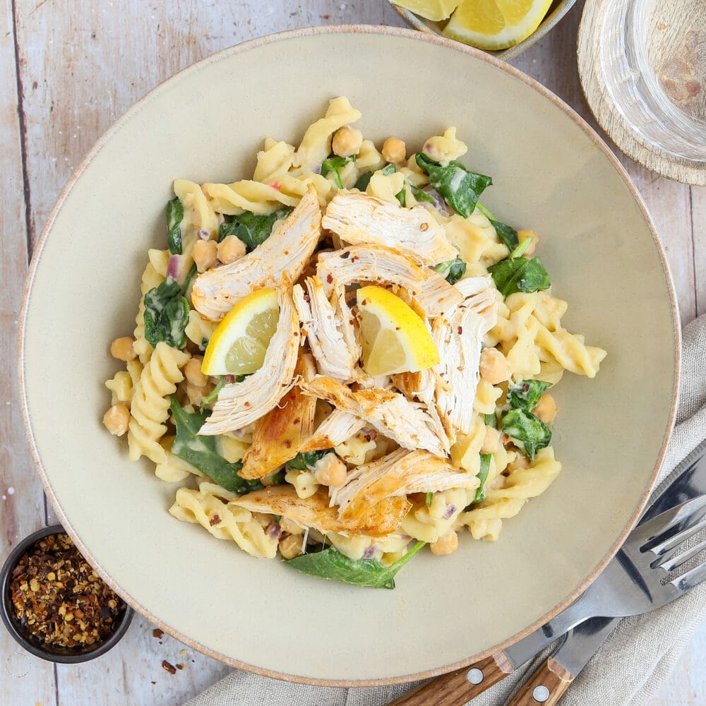 Pulled Chicken auf Hummus-Pasta mit Kichererbsen und Spinat