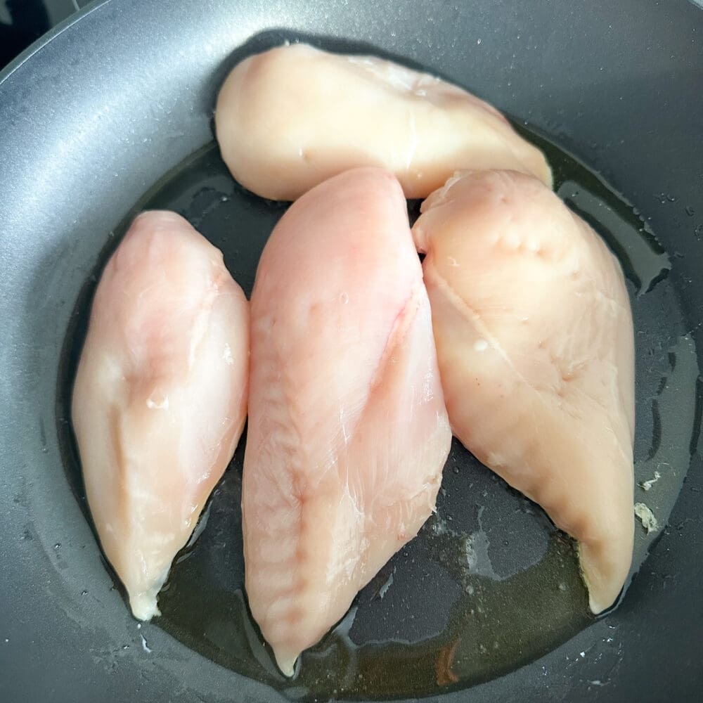 | 1. | Zuerst die Hähnchenfilets in 1 EL Öl circa 5 bis 7 Minuten von jeder Seite goldbraun anbraten. |