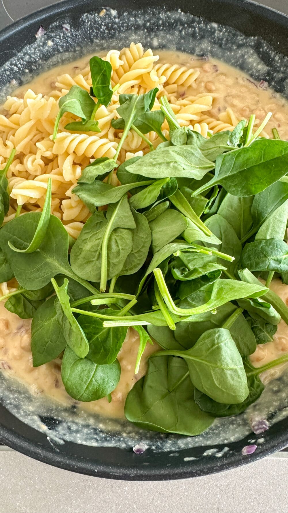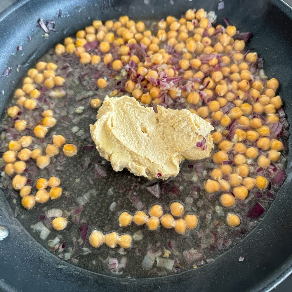 Als nächstes den Hummus dazugeben und alles mit Pastawasser zu einer cremigen Sauce verrühren. |