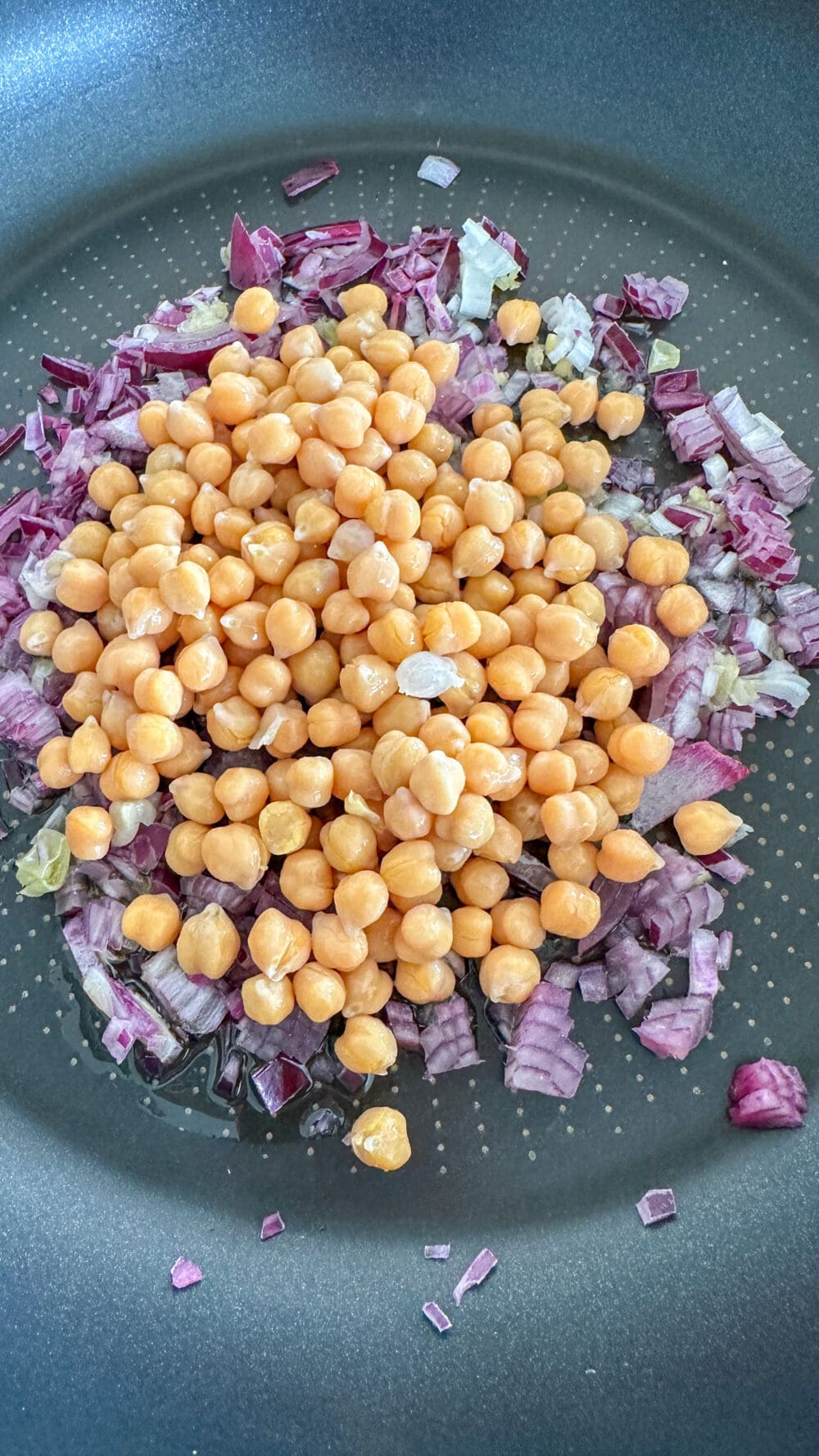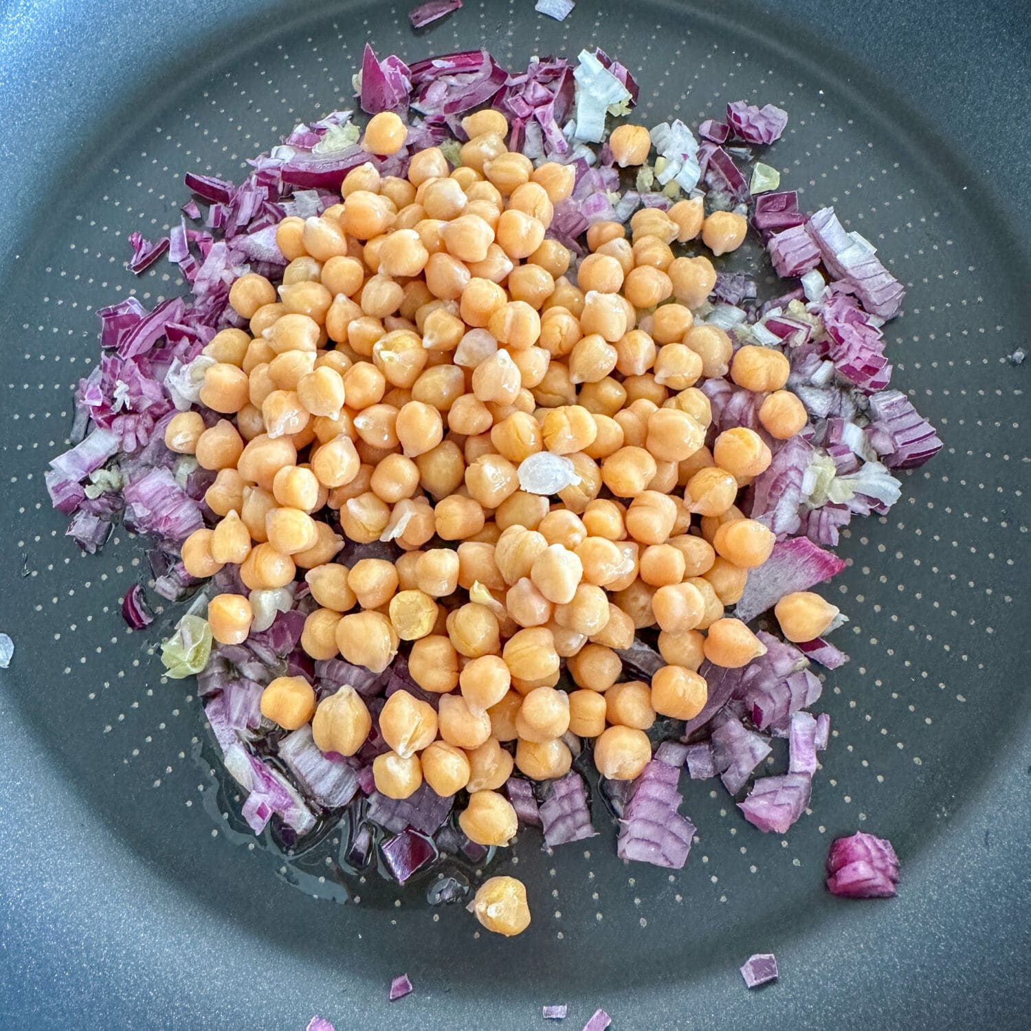 | 4. | Jetzt Zwiebel und 2 Knoblauchzehen schälen und fein würfeln und mit den Kichererbsen in 1 EL Öl anrösten. |