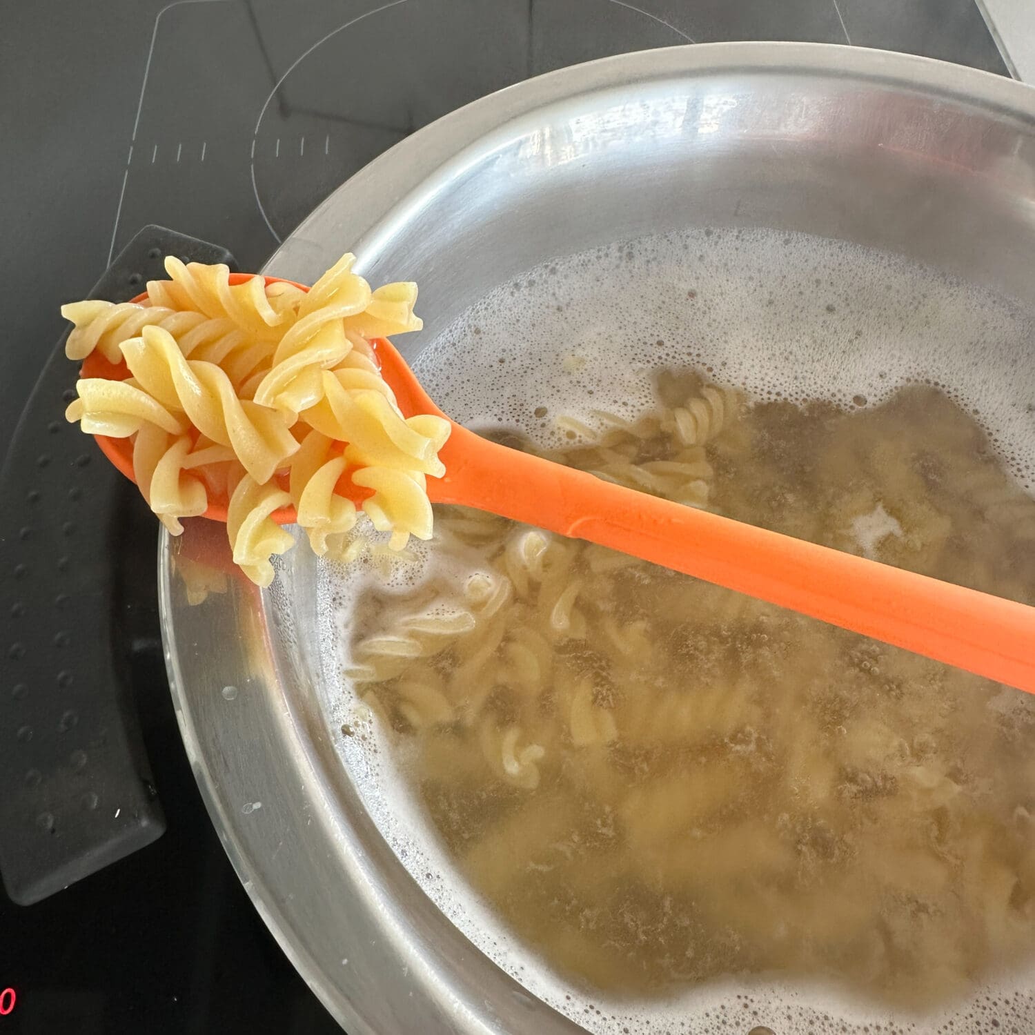| 5. | Als nächstes den Hummus dazugeben und alles mit Pastawasser zu einer cremigen Sauce verrühren. |