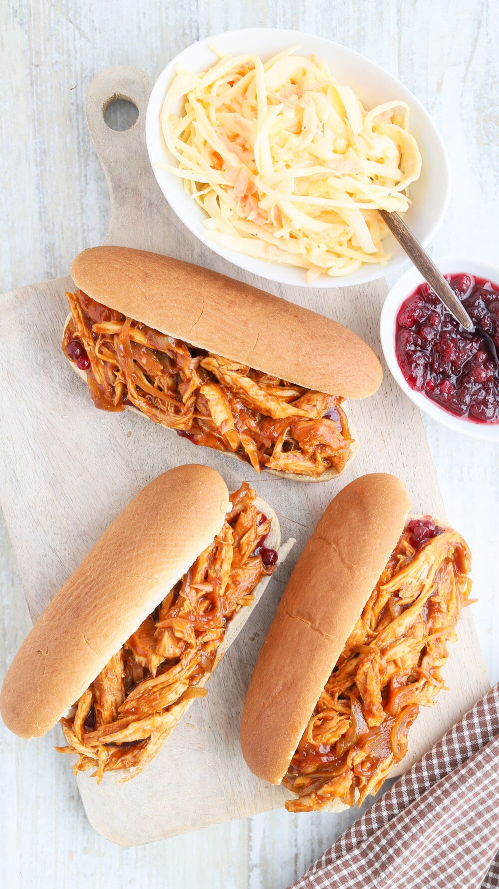 | 8. | Zum Schluss die Hot Dog Brötchen mit Preiselbeeren bestreichen, mit Pulled Pute toppen und mit dem Krautsalat genießen. |