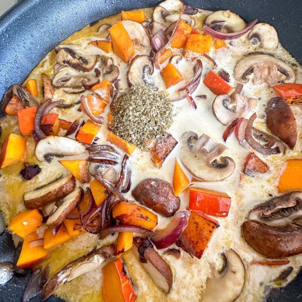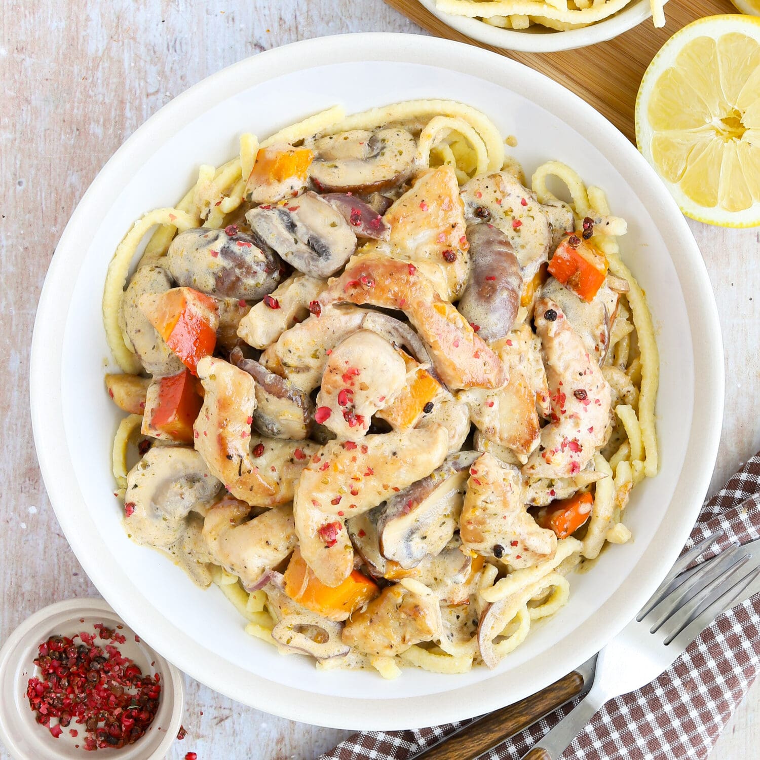 Puten-Kürbispfanne mit Champignons und Spätzle