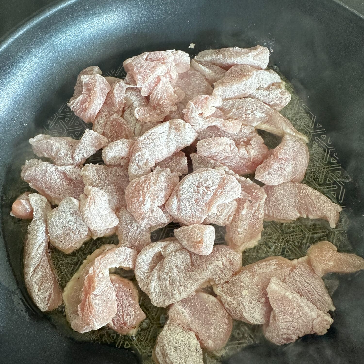 | 1. | Zuerst die Putenfilets kleinschneiden und mit Mehl und etwas Salz und Pfeffer mischen. |