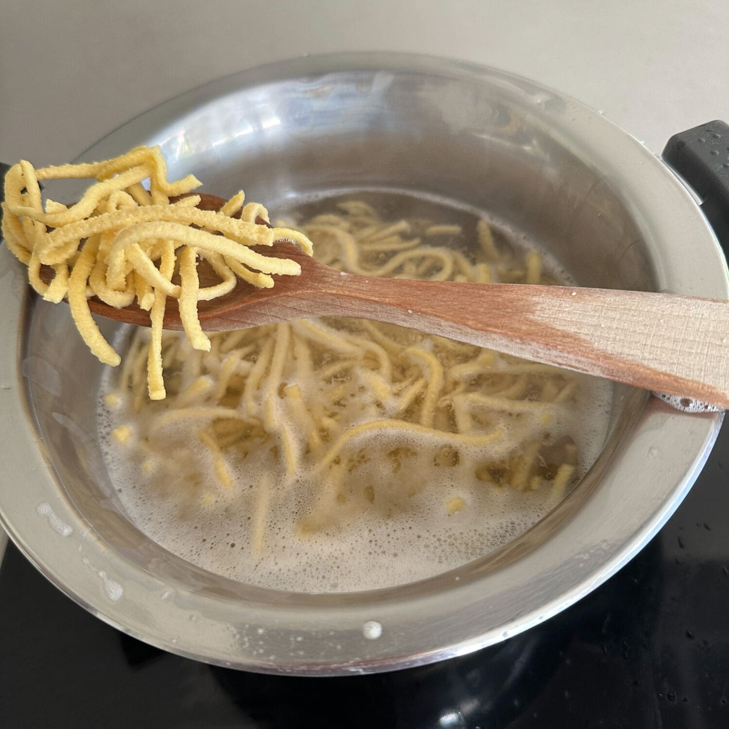 Zum Schluss das Putenfleisch unterheben und noch einmal aufkochen. |