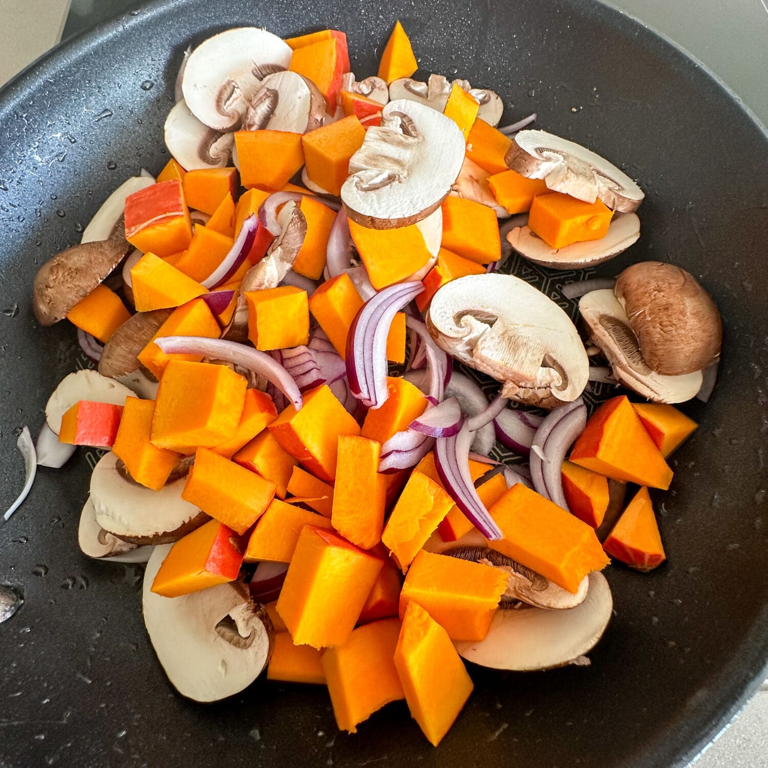 | 5. | Die Zwiebel schälen und fein würfeln, den Kürbis halbieren, die Kerne entfernen und ebenfalls in Würfel schneiden. Die Champignons putzen und halbieren. Alles zusammen in dem Bratfett anrösten. |