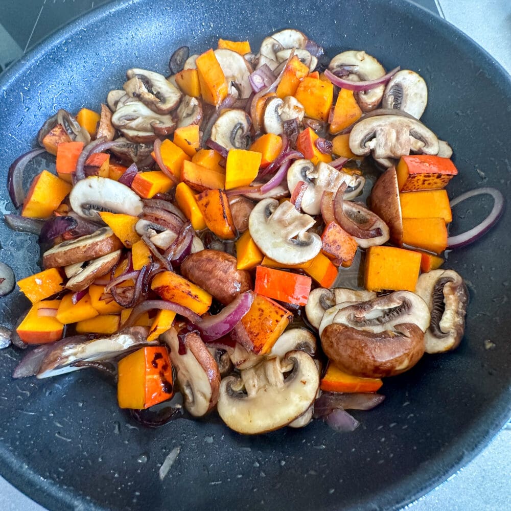 Die Zwiebel schälen und fein würfeln, den Kürbis halbieren, die Kerne entfernen und ebenfalls in Würfel schneiden. Die Champignons putzen und halbieren. Alles zusammen in dem Bratfett anrösten. |