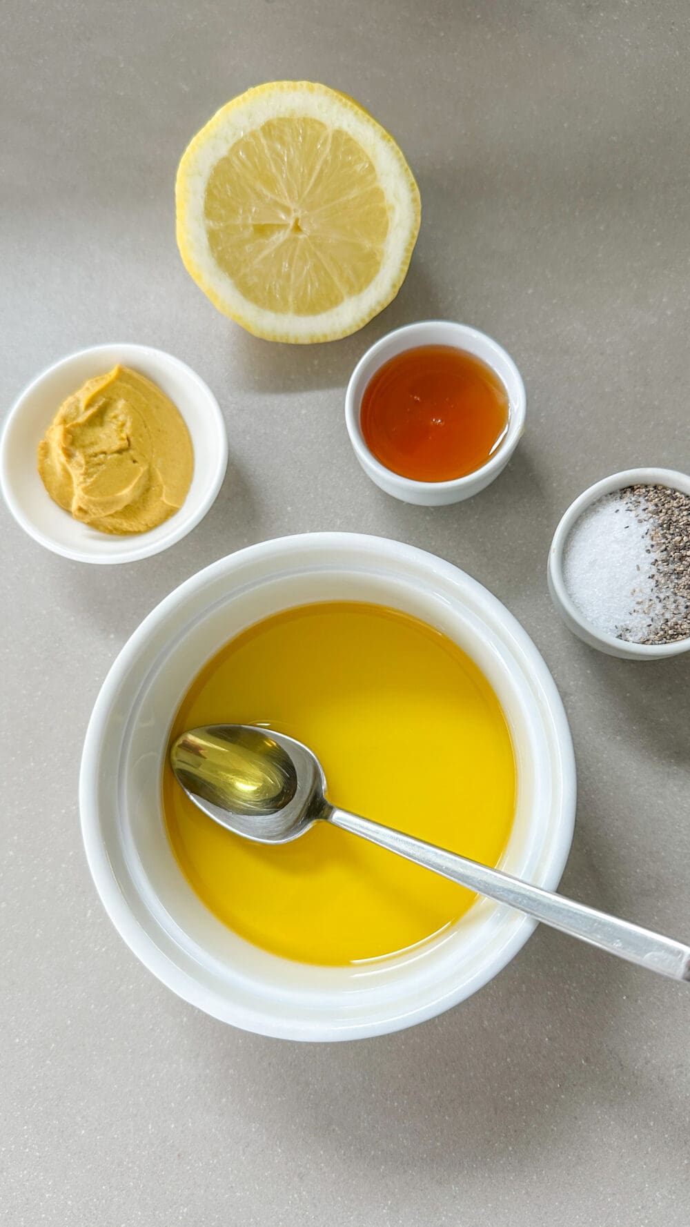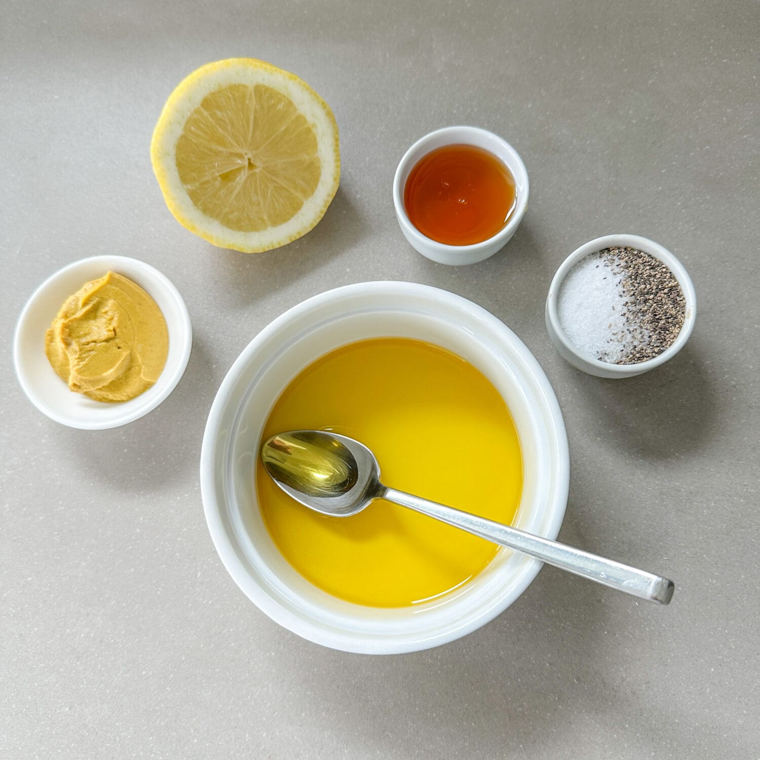 Für die Marinade Öl, Senf und Honig mischen und mit Zitronensaft und Salz und Pfeffer abschmecken. |