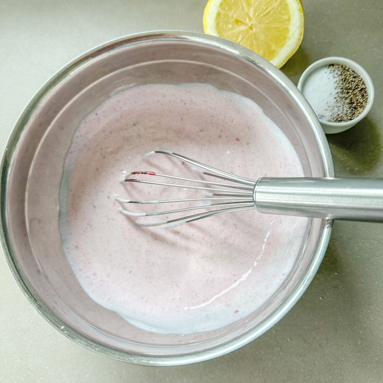 Für den Dip Saure Sahne, Joghurt und Wildpreiselbeeren mischen und mit Zitronensaft und Salz und Pfeffer abschmecken. |