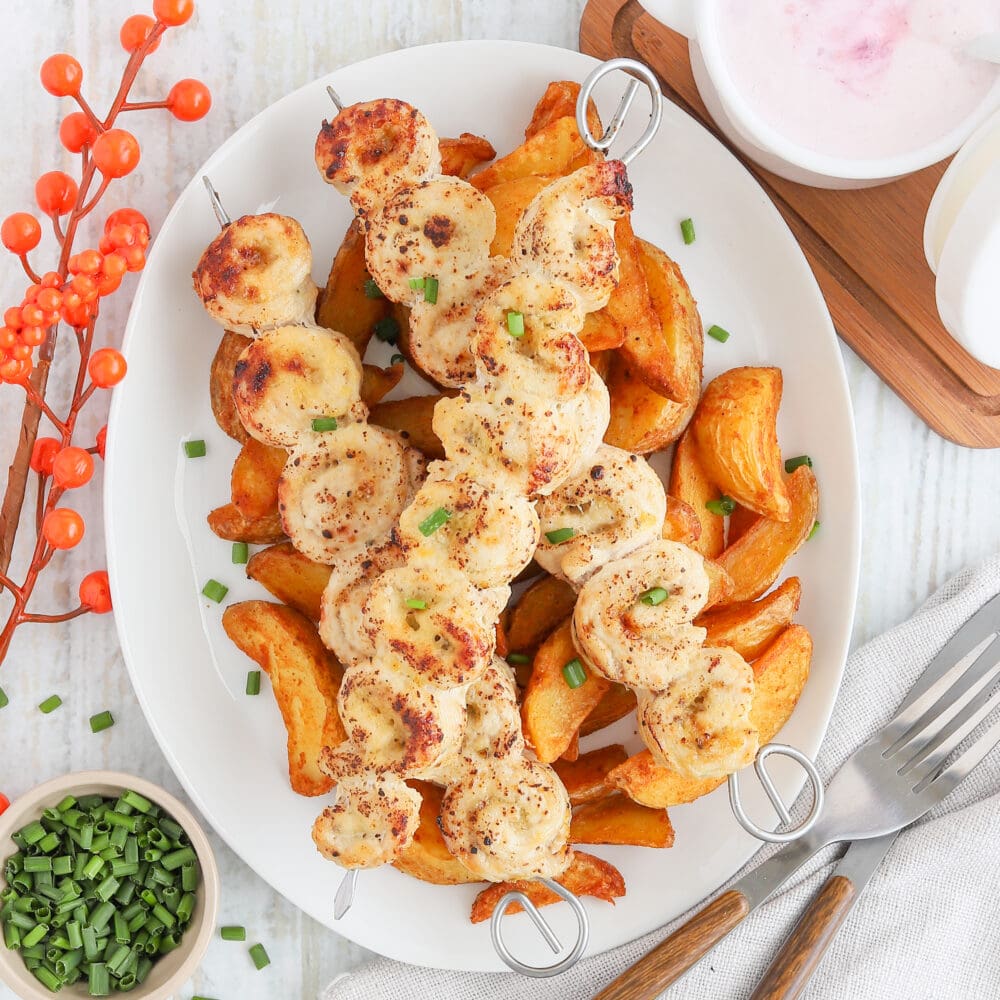 Die Puten-Parmesanröllchen auf den Wedges anrichten, mit Schnittlauch toppen und genießen! |