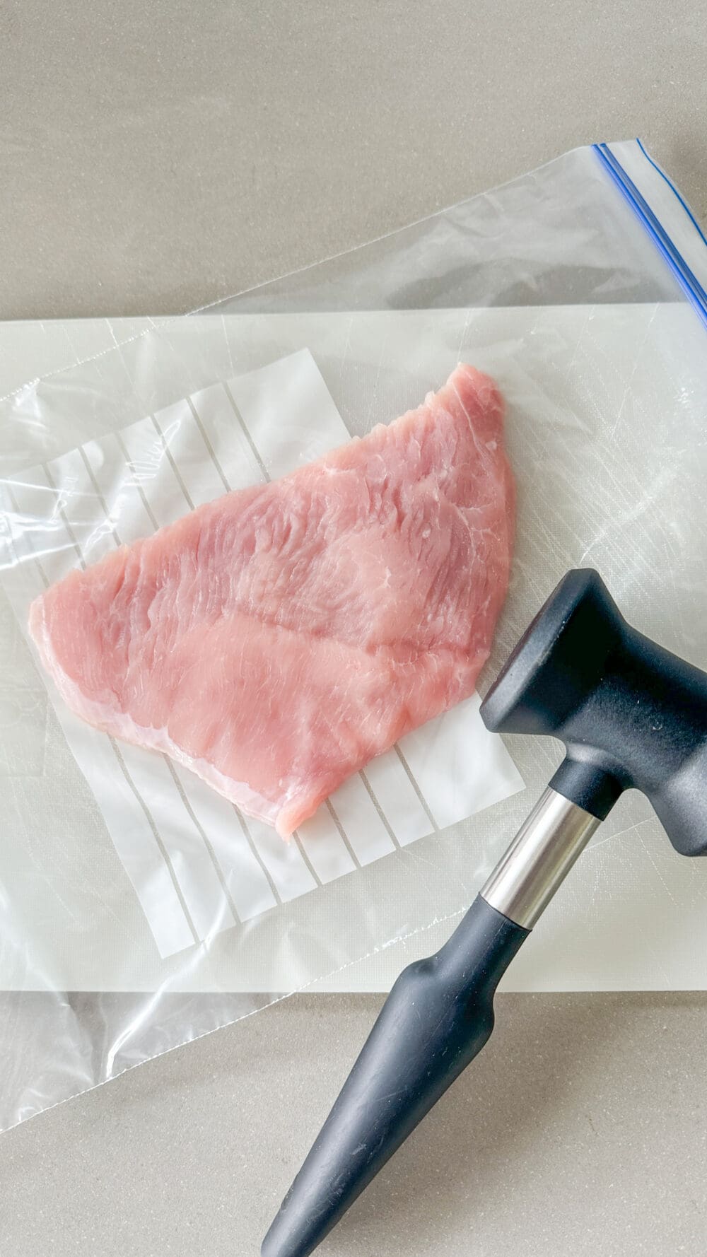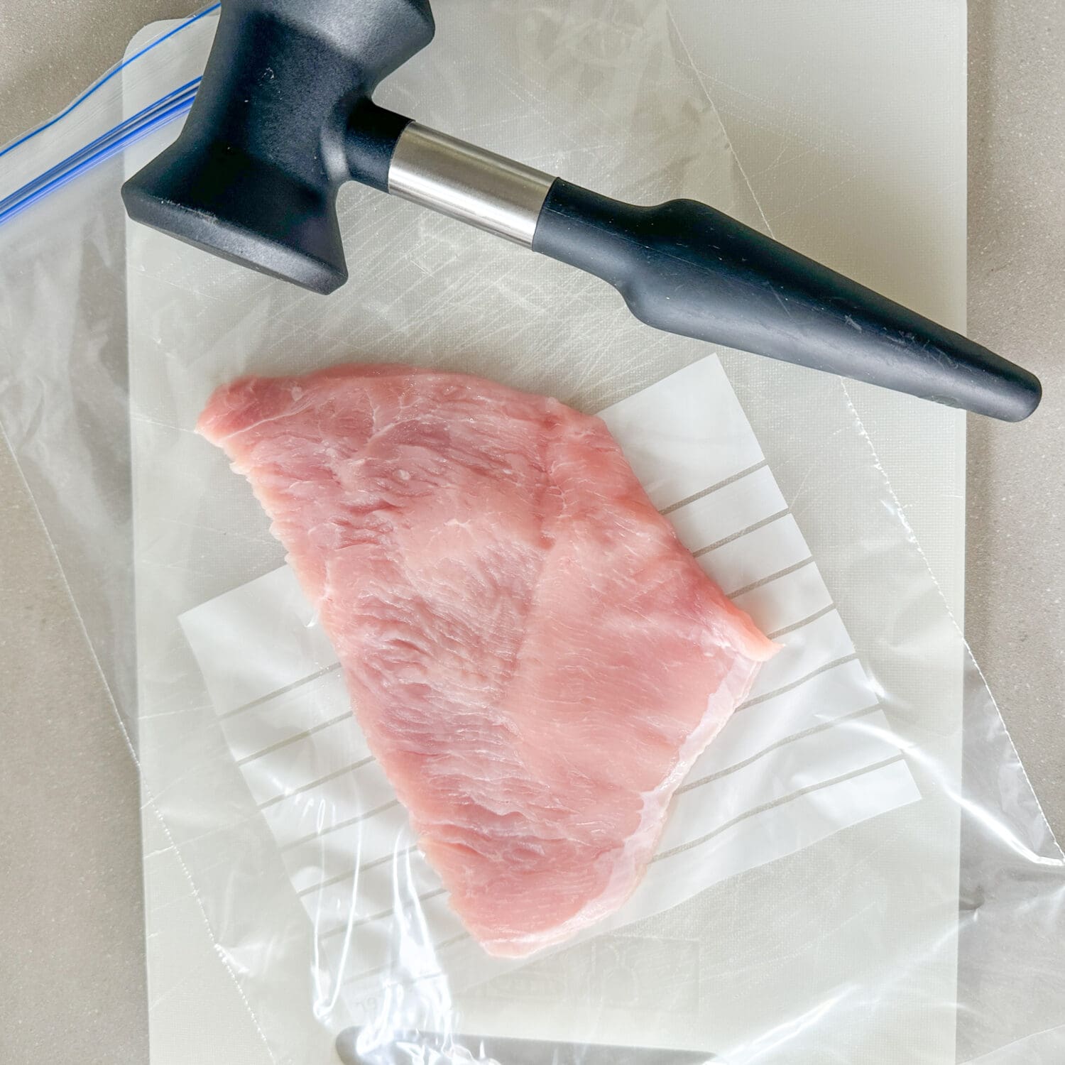 | 1. | Putenschnitzel in einen Gefrierbeutel geben und mit einem Fleischklopfer plattieren. |